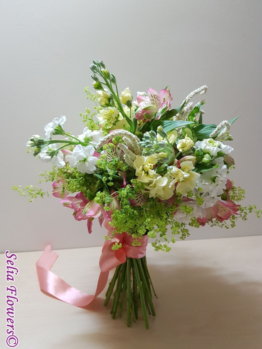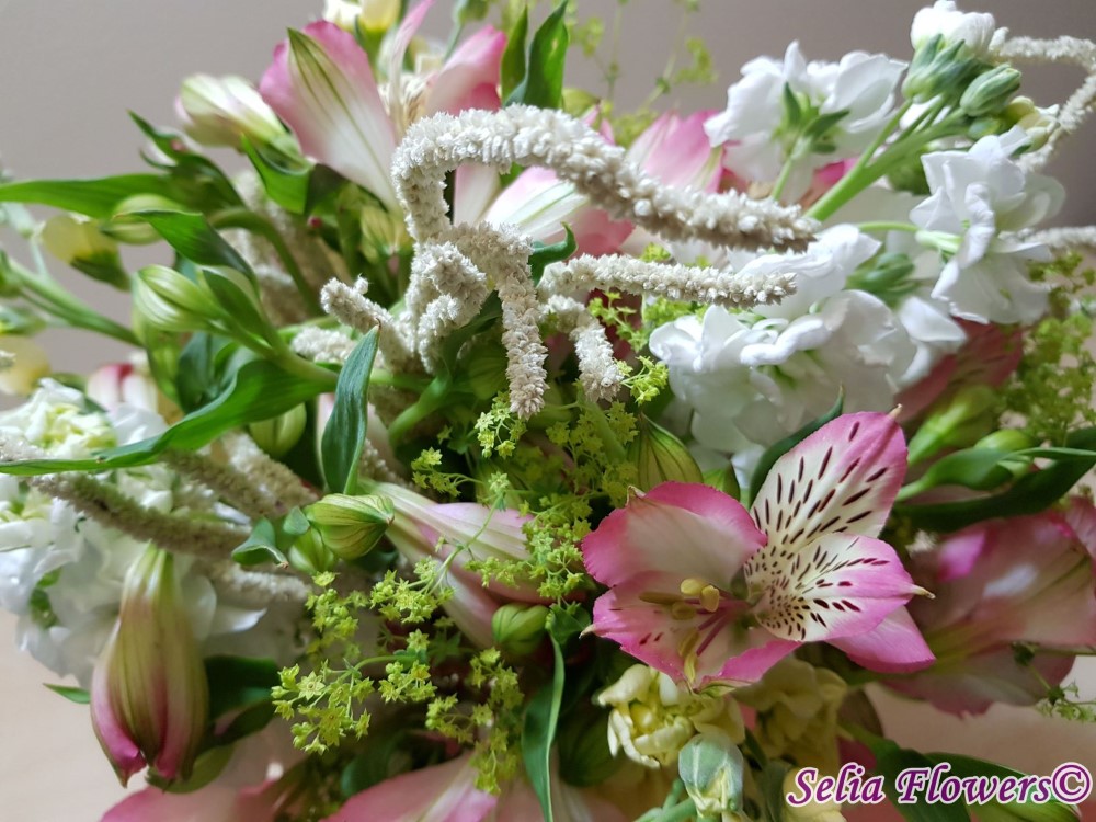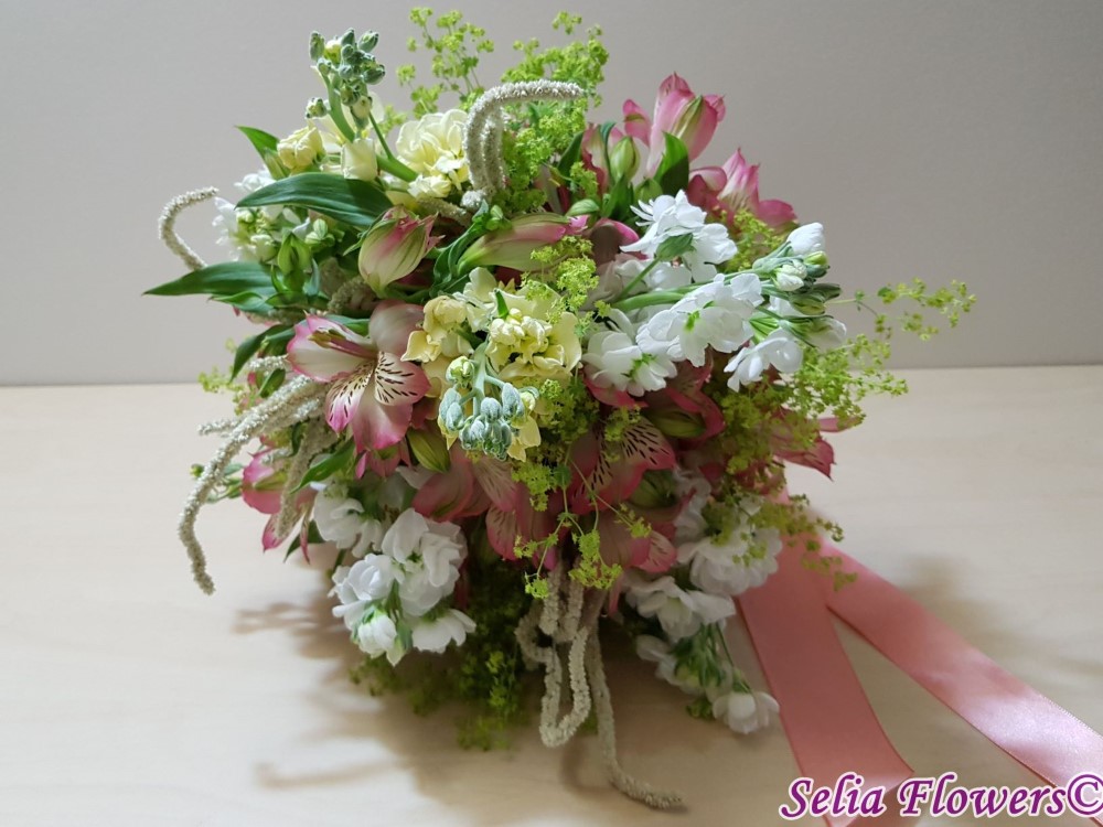 Un buchet vesel, invaluit de miresme delicate, realizat din mathiola, alstroemeria si amaranthus.