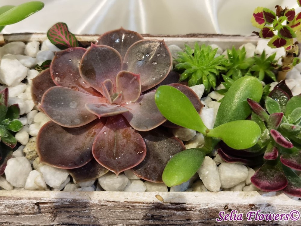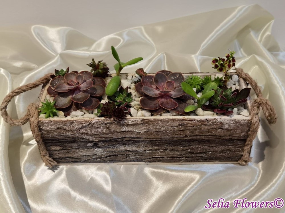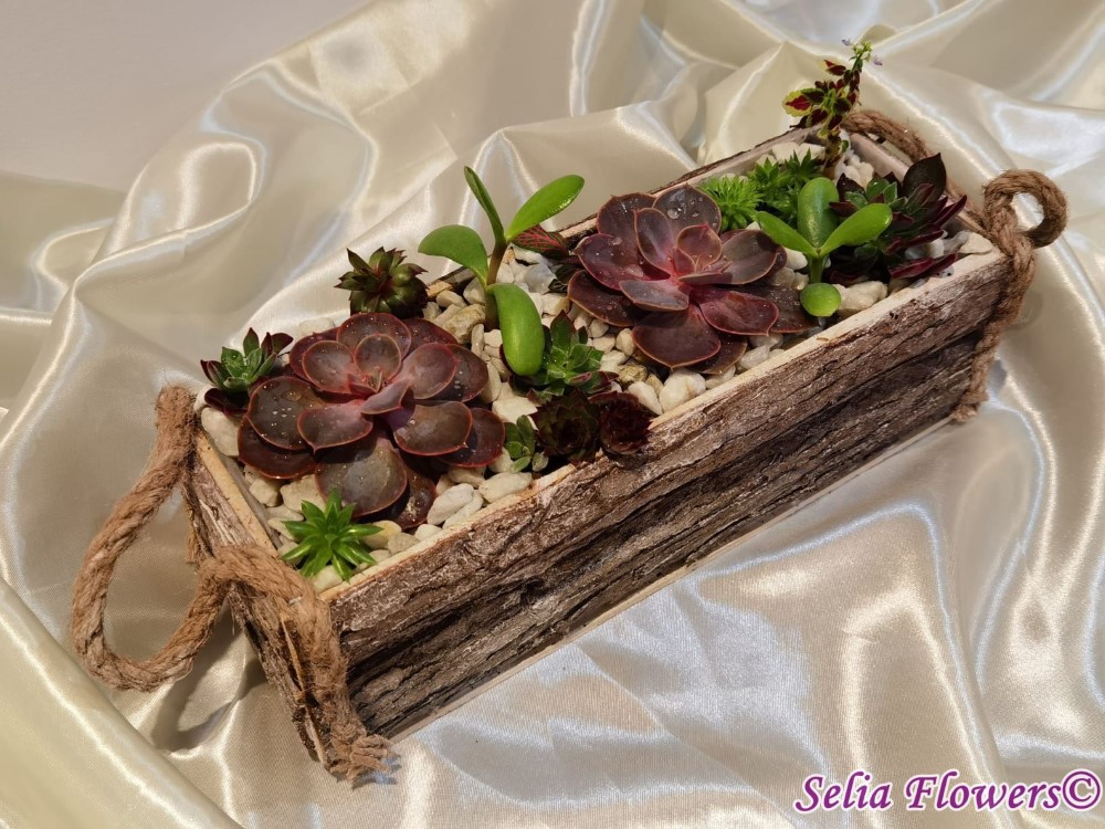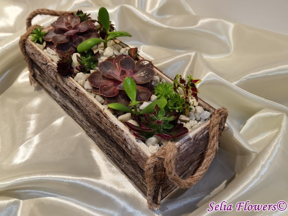 O gradina vesela in miniatura construita in vas din scoarta de copac dintr-un mix de plante suculente. Aranjamentul este decorat cu pietricele de marmura decorativa Este un aranjament vesel, decorativ si deloc pretentios. Daca adori calatoriile sau esti plecat mai mult timp de acasa, reprezinta florile ideale, deoarece rezista destul de mult timp fara sa fie udate.