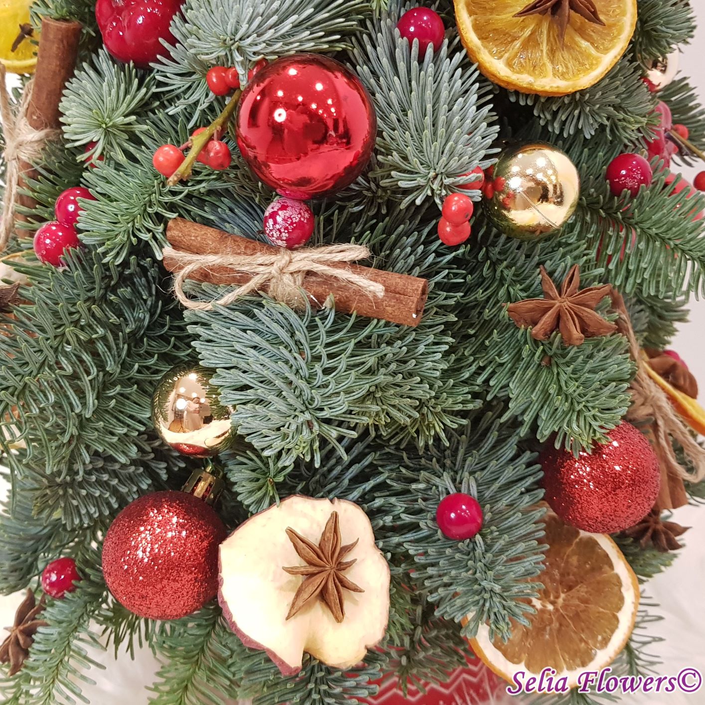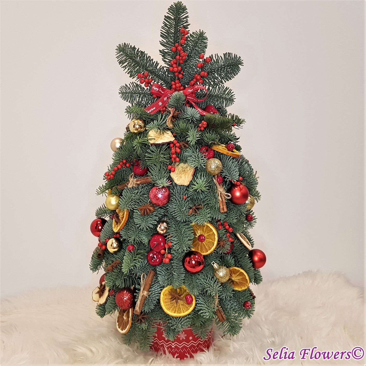 Un brăduț construit crenguță cu crenguță, un aranjament unicat construit handmade din brad Nobilis, pe suport de burete umed care asigură hidratarea crenguțelor.