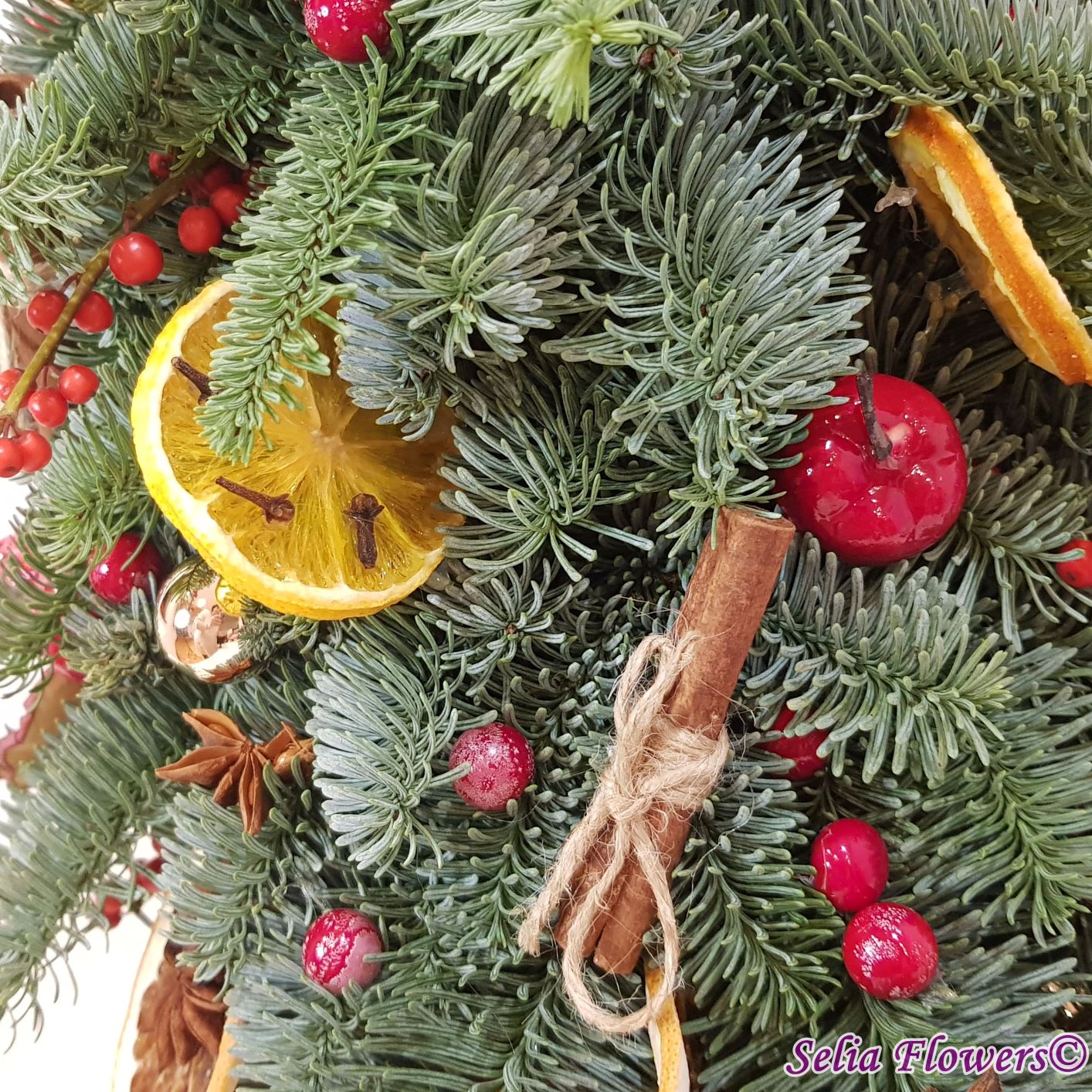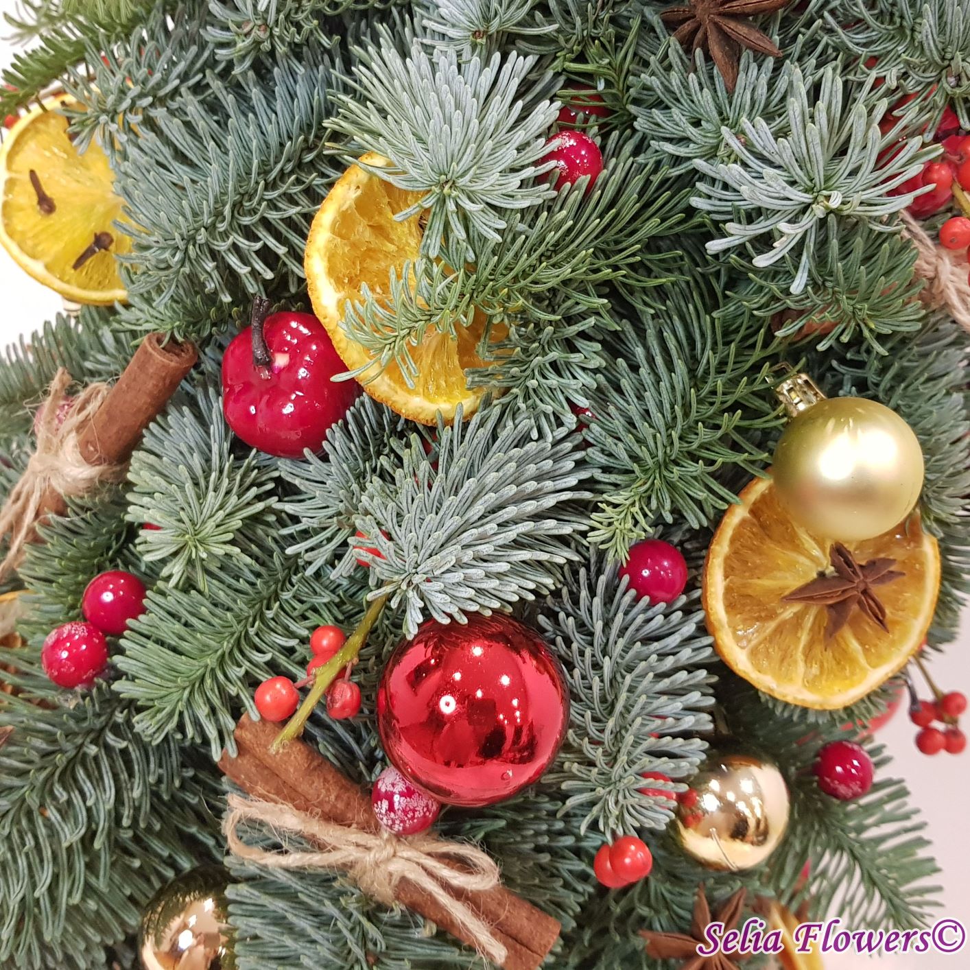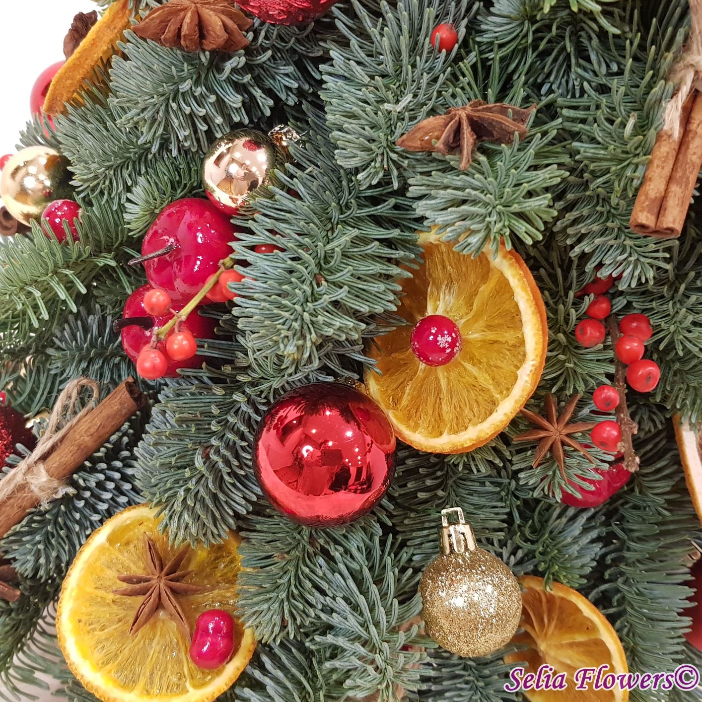 Este accesorizat cu ilex, globulețe de culore roșie și aurii, merișoare, panglică decorativă de culoare roșie și elemente decorative aromate – batoane de scorțișoară, felii de fructe deshidratate, anason și cuișoare.