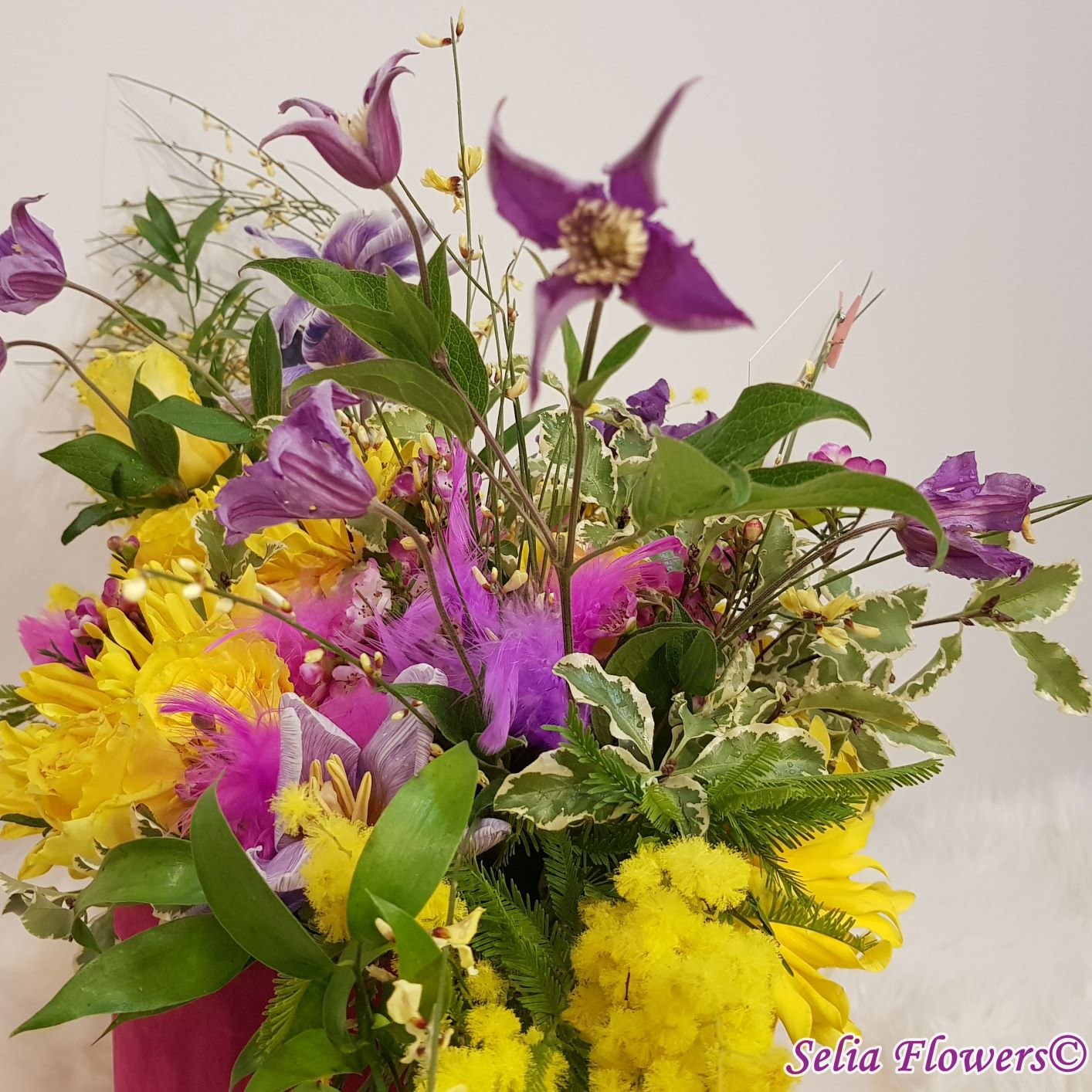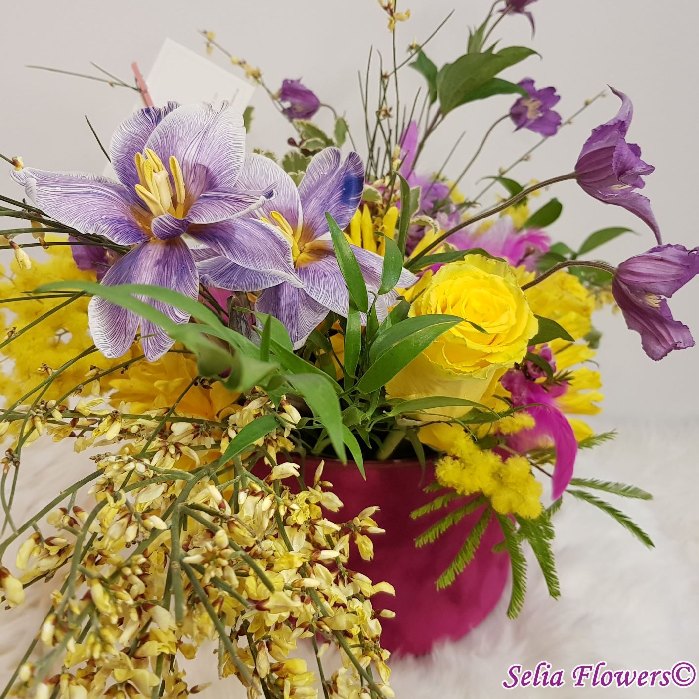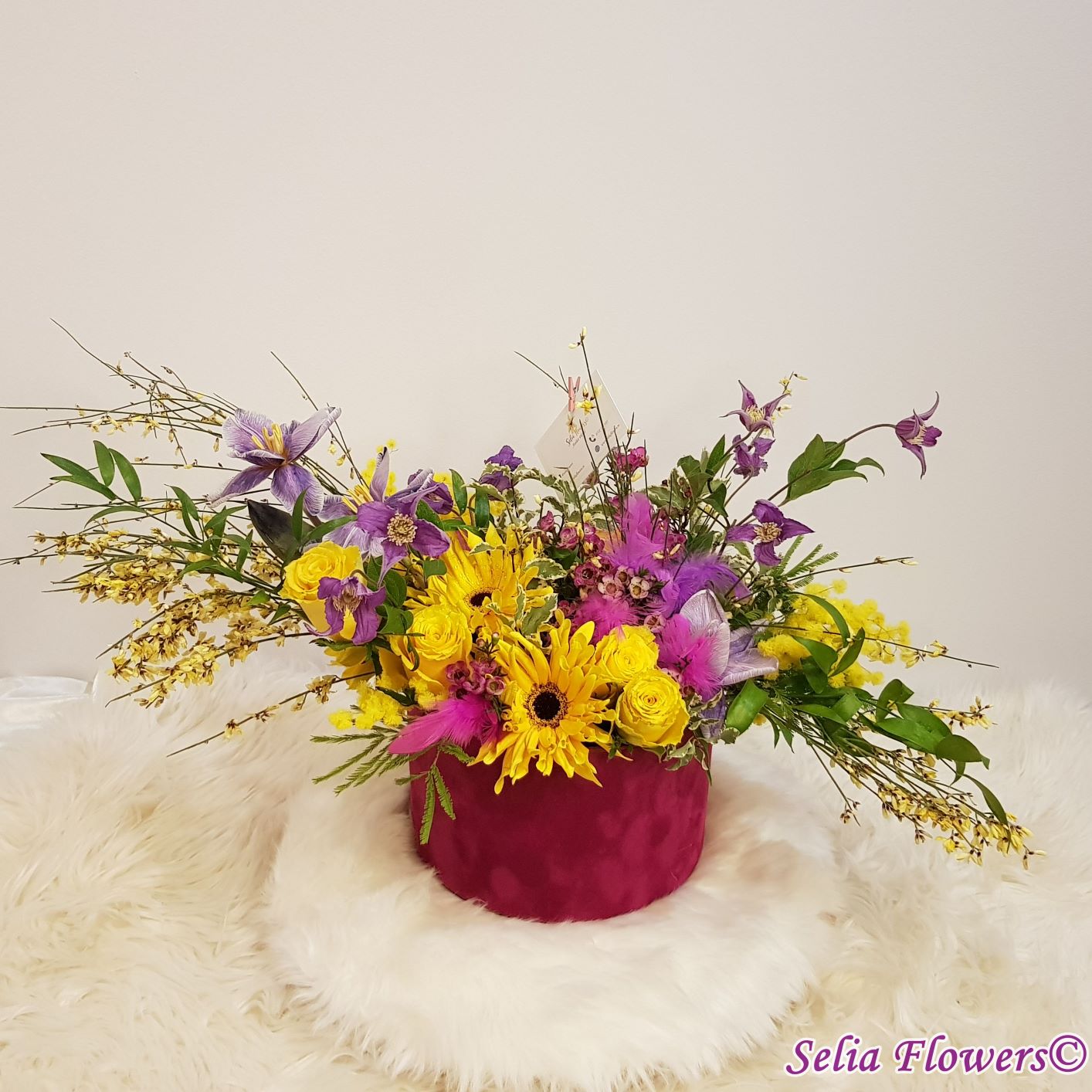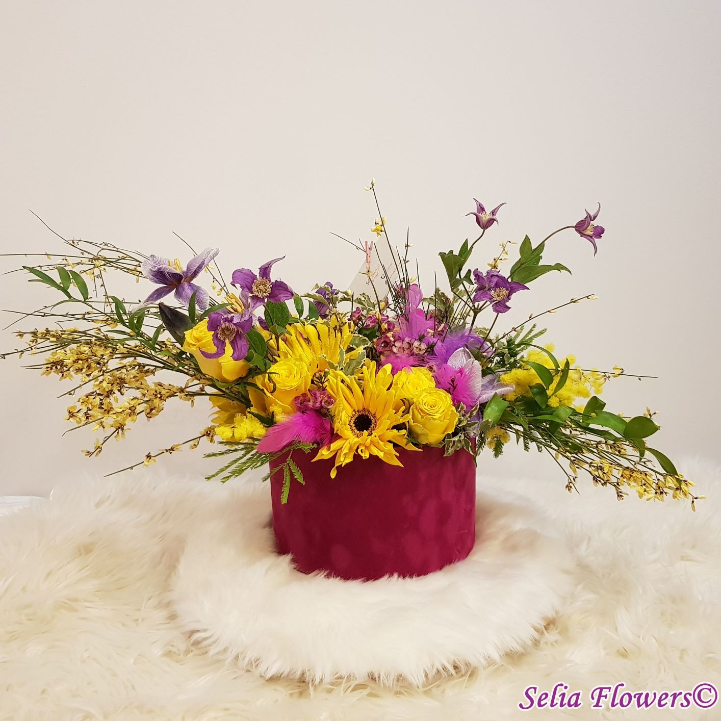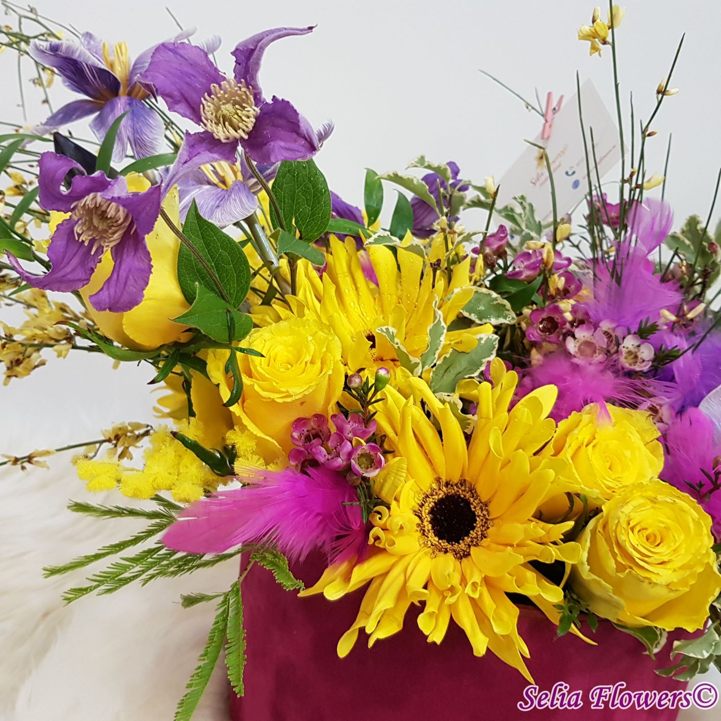 Un aranjament vesel și parfumat, construit în cutie de catifea cu flori de primăvară (lalele vip, clematite, wax flowers, germini spider, acacia, trandafiri, pittosporum nigra ) și accesorii sub formă de pene de strut colorate .