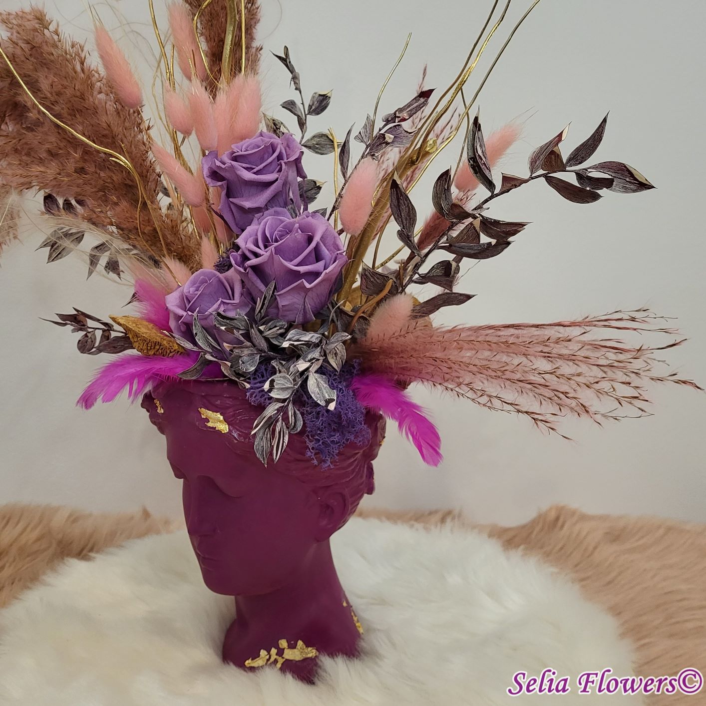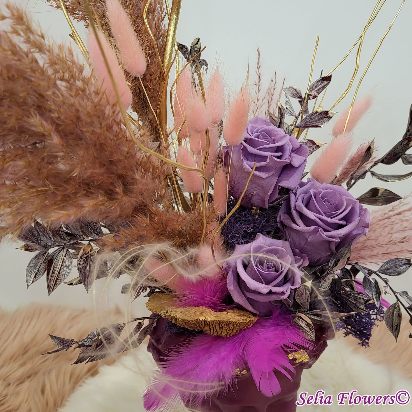 Un aranjament permanent, în tonuri de mov și roz pal, construit în vas Venus, cu trandafiri criogenați și flori naturale stabilizate și/sau uscate. Un aranjament rezistent în timp.