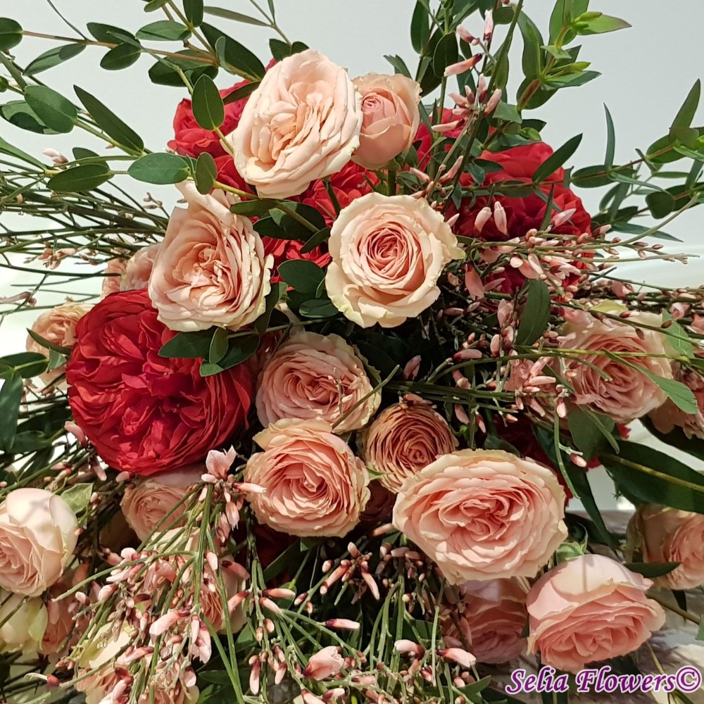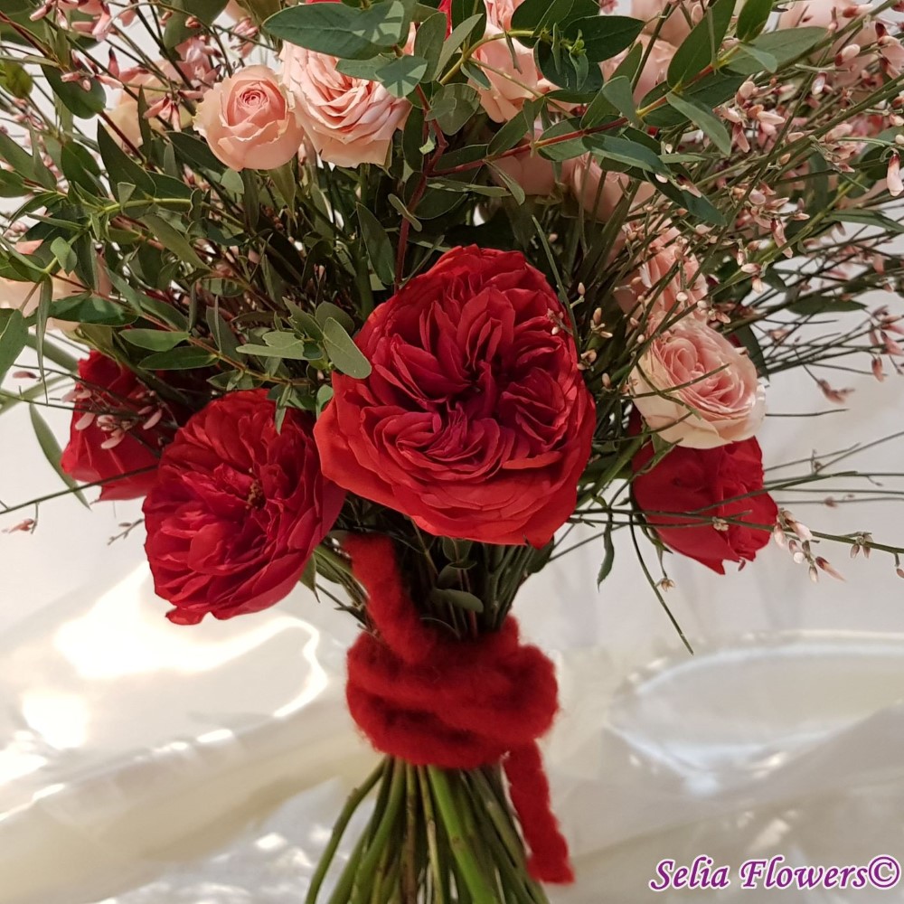 Buchet din trandafiri red piano, trandafiri tros, ginster, verdeata si accesorii.