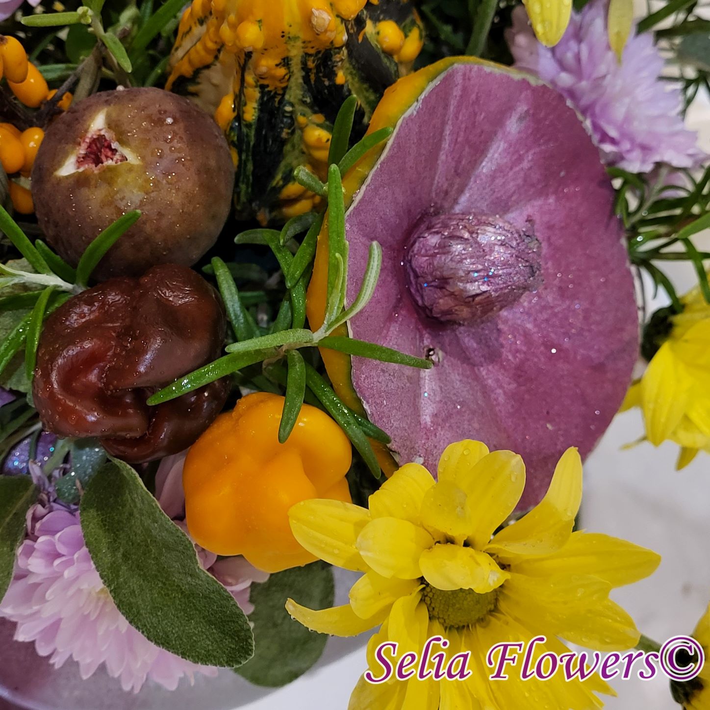 Dovleacul este vopsit și are culoarea mov combinată cu argintiu.