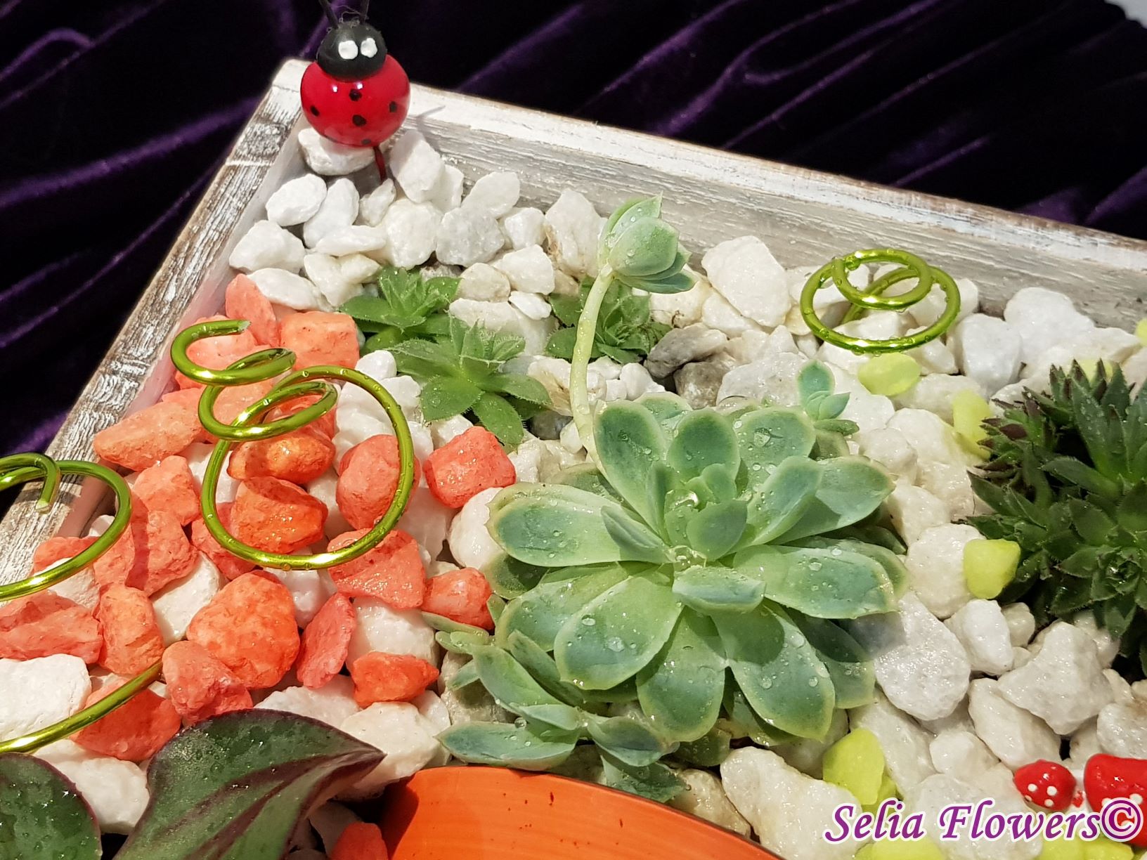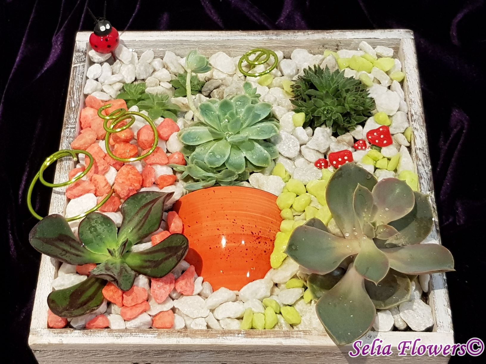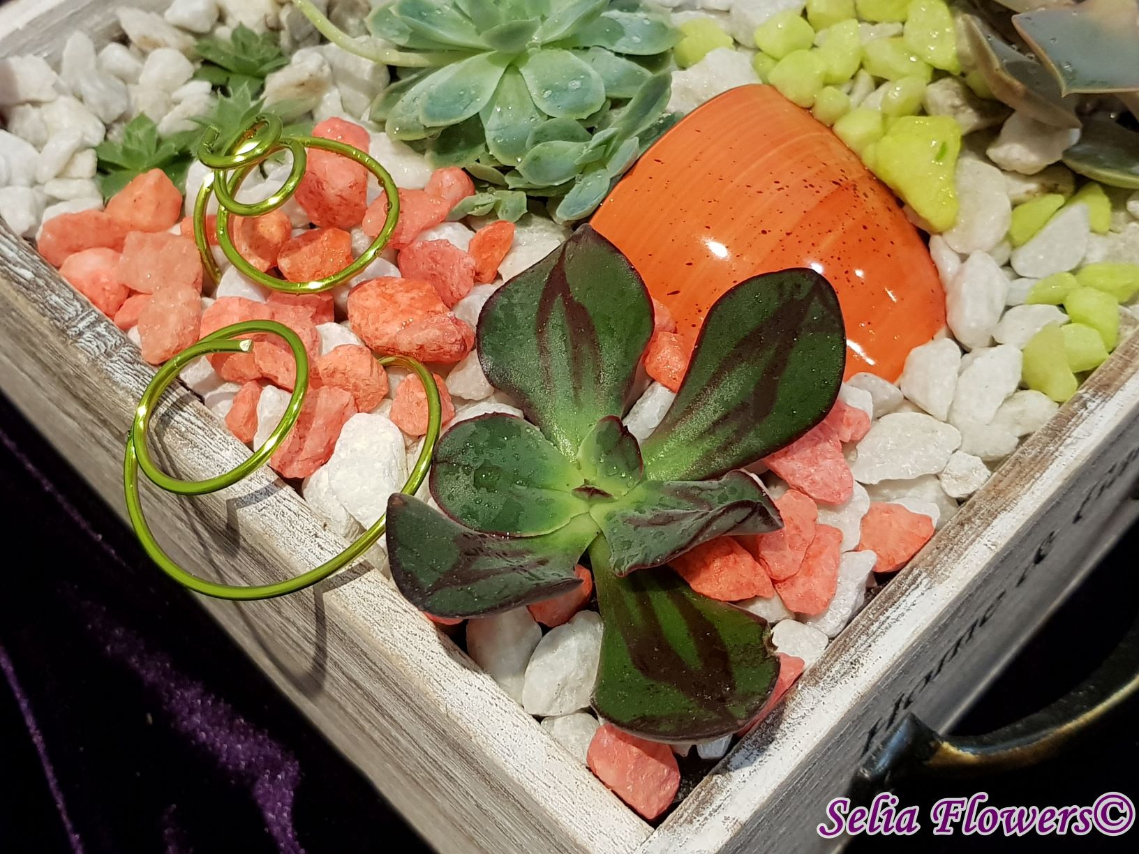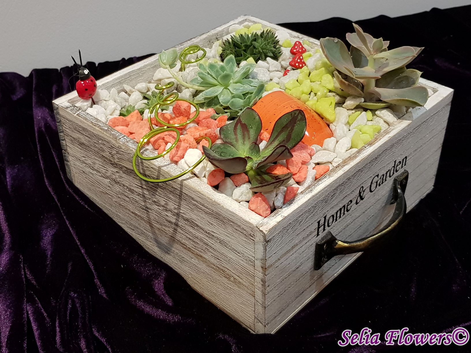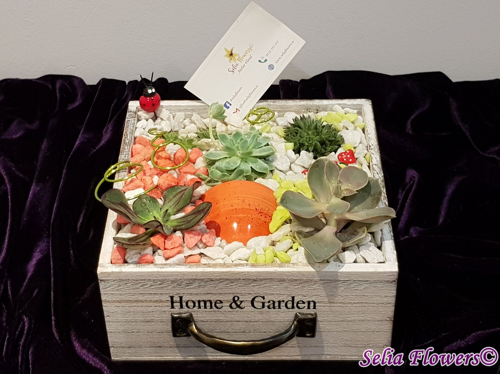 Un aranjament vesel, decorativ și elegant construit în cutie de lemn tip sertar, dintr-un mix de plante suculente, accesorii decorative, marmură albă și pietre decorative in diverse culori. Potrivit atât ca aranjament de business, dar și pentru a fi daruit unei persoane dragi care se poate bucura mult timp de el de acum inainte.