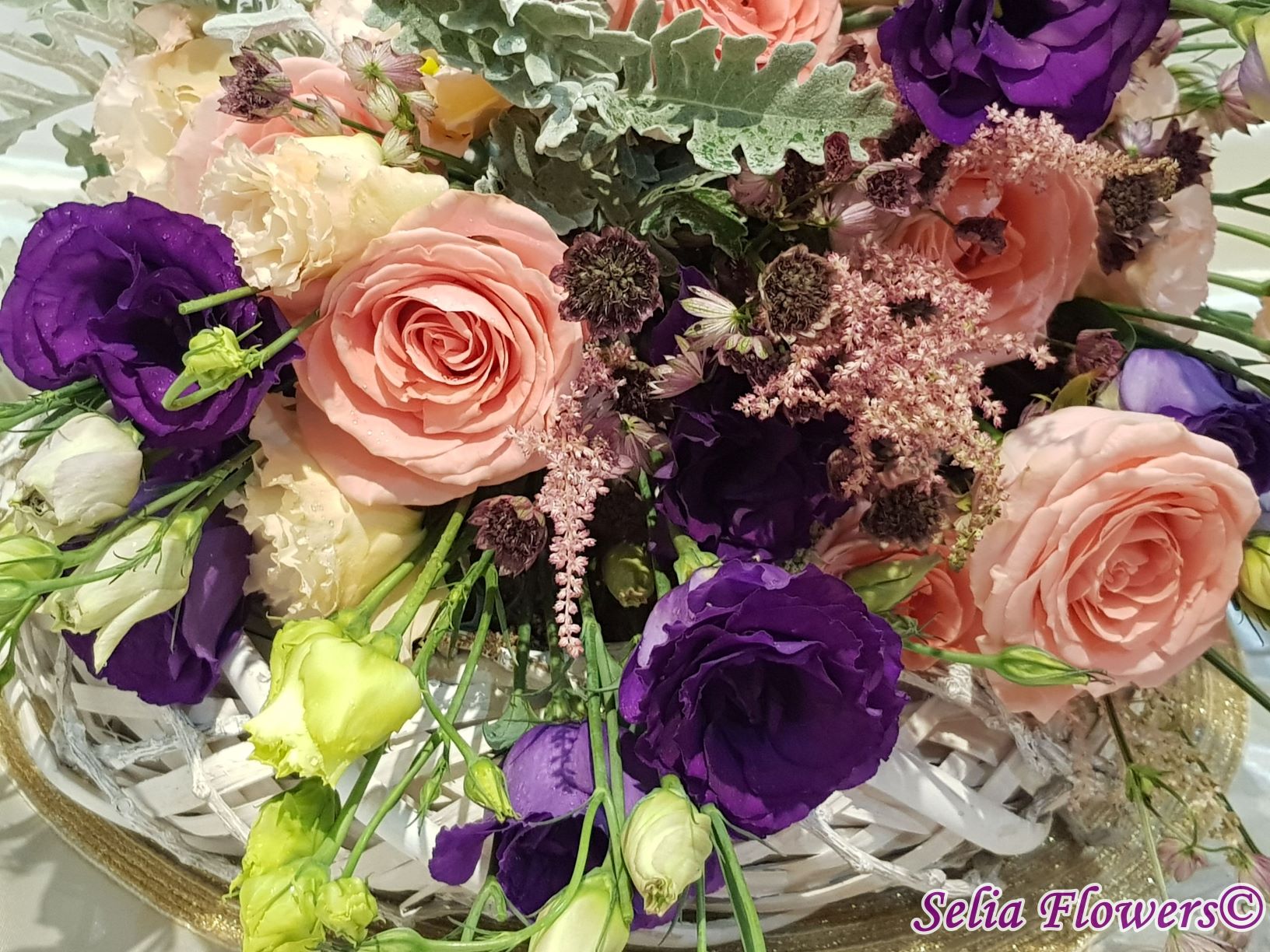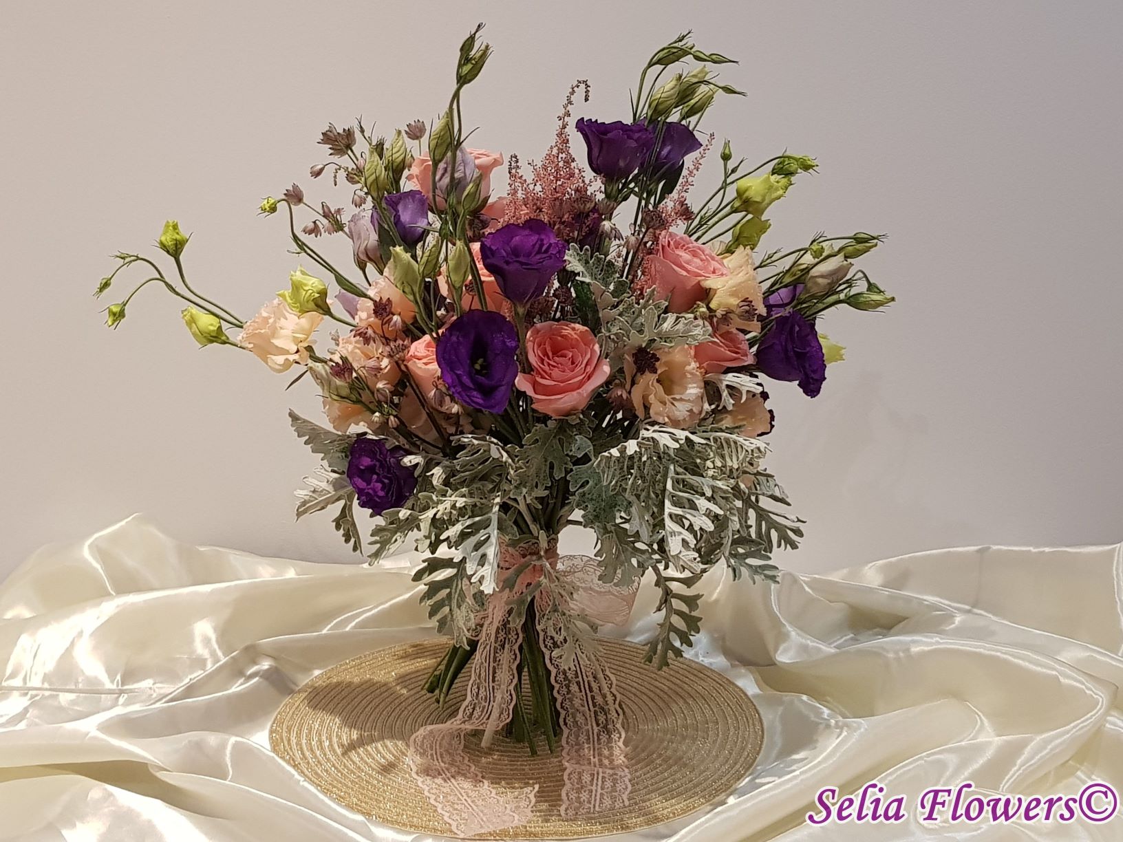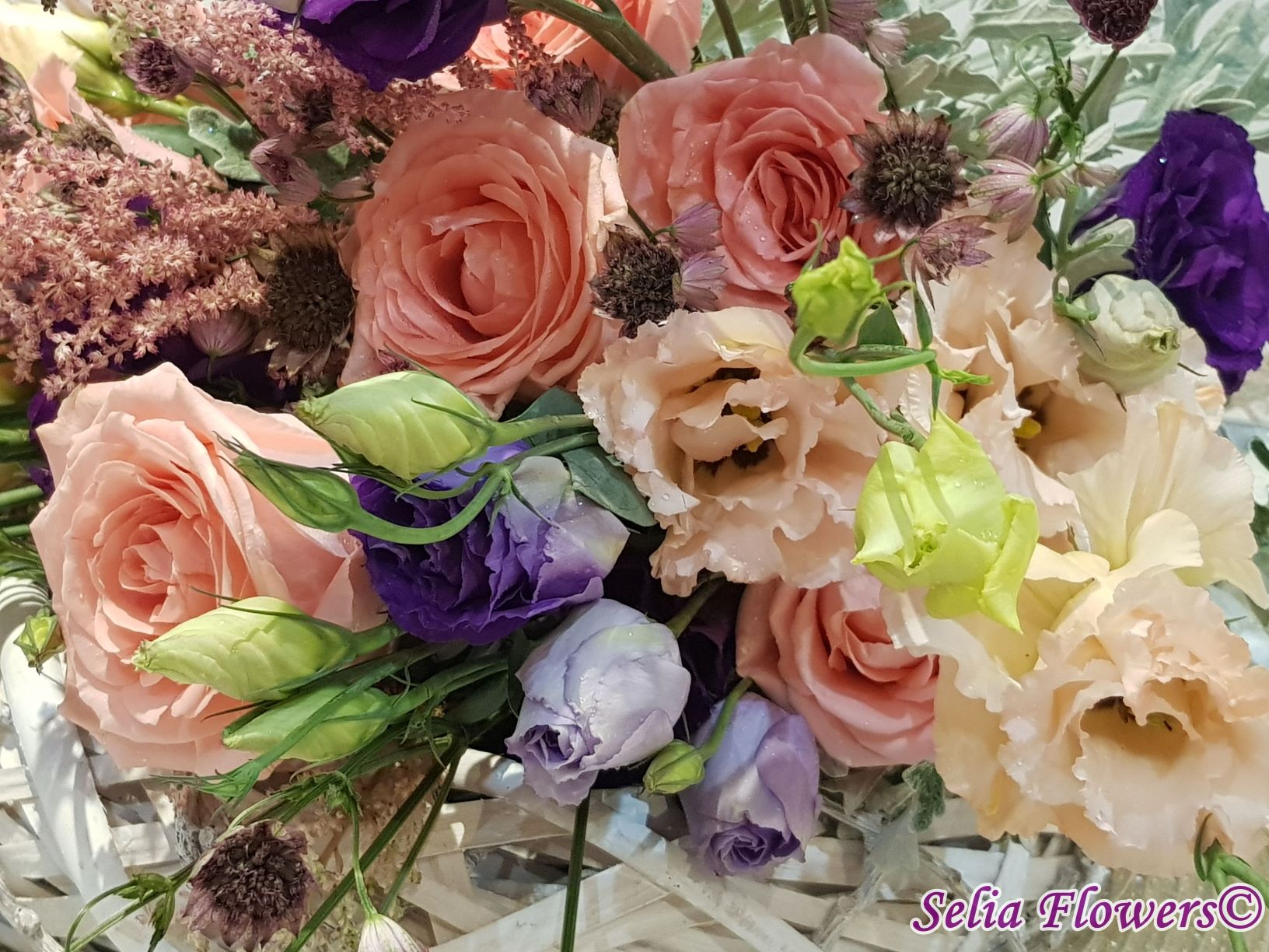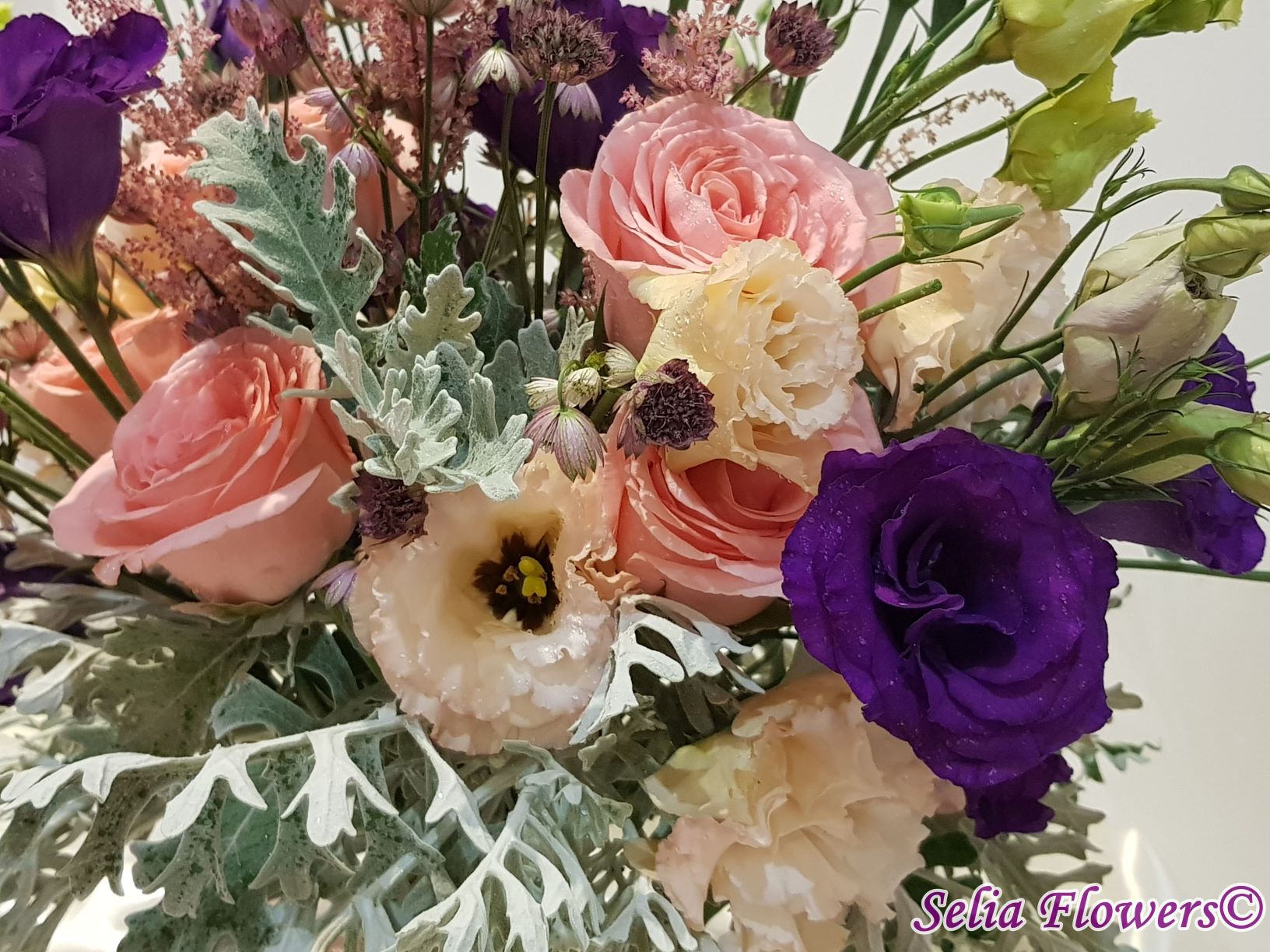 Un buchet vesel si plin de culoare, construit cu trandafiri, lisianthus,astrantia, asrilbe, senecio