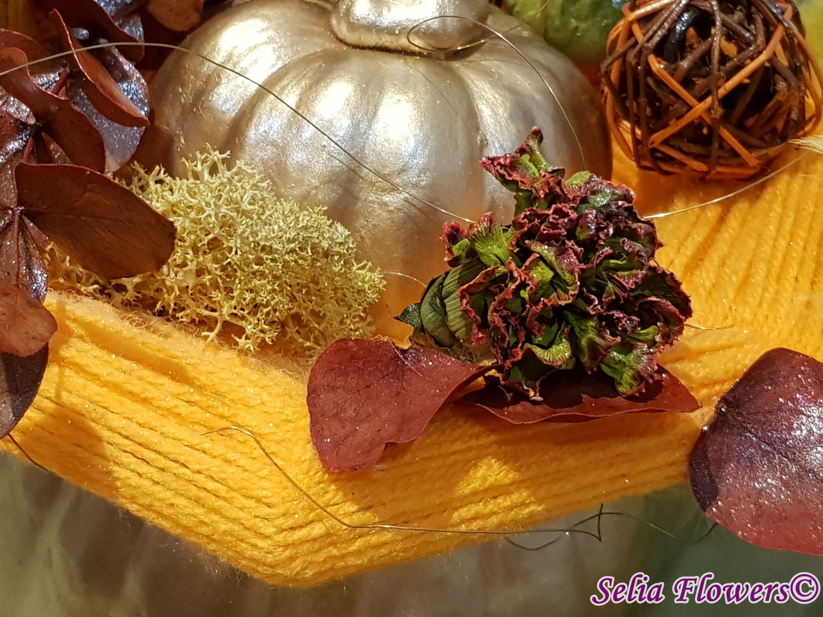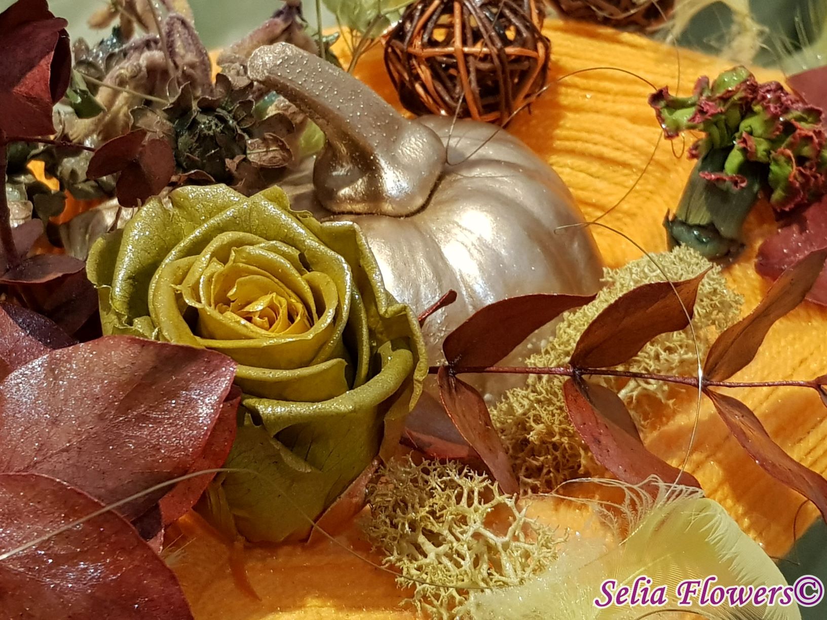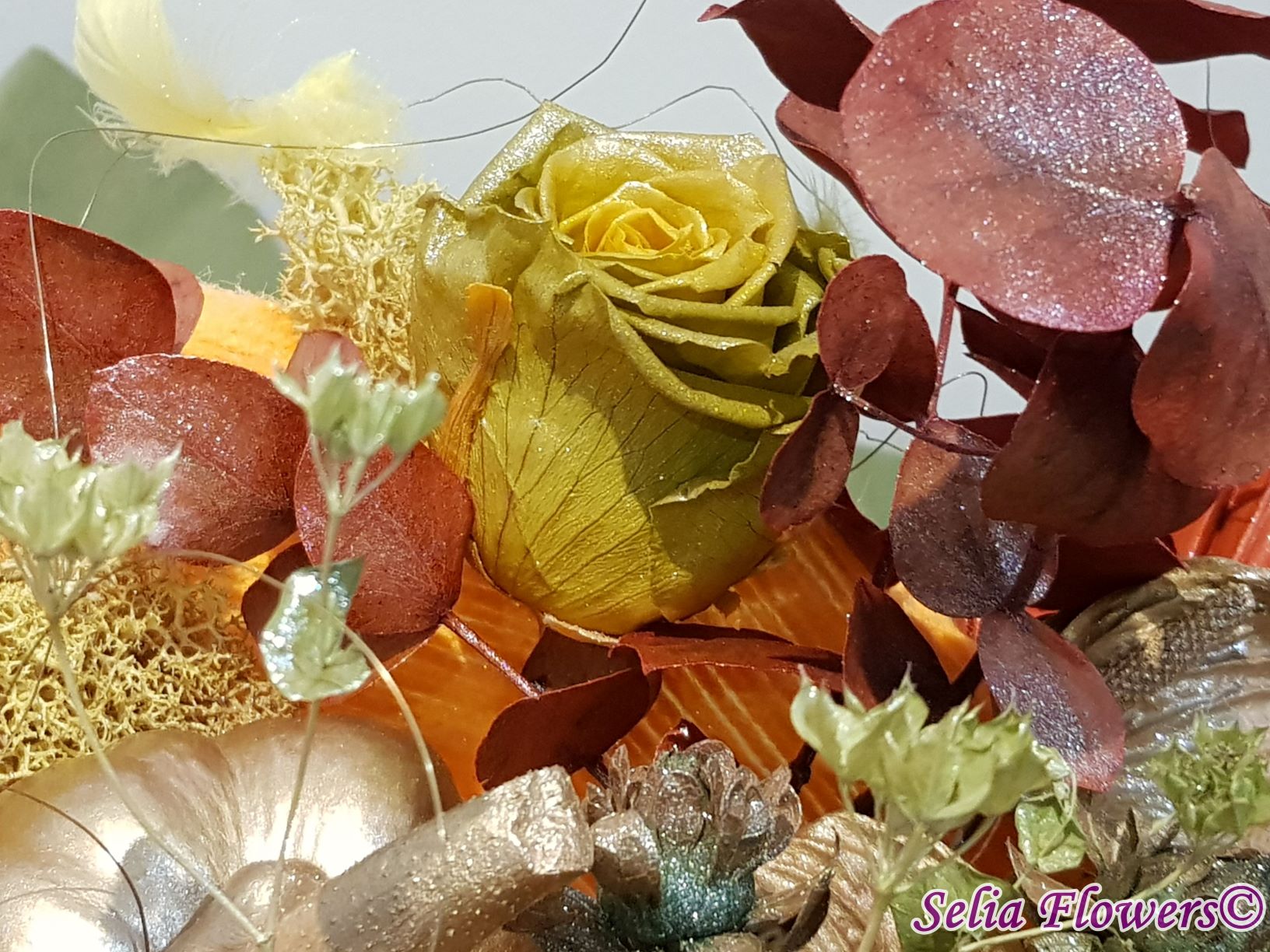 Aranjamentul floral este realizat pe structura spider construita pe dovleac, cu trandafir criogenat si flori naturale uscate sau conservate. Dovleacul este vopsit in culoarea aurie.