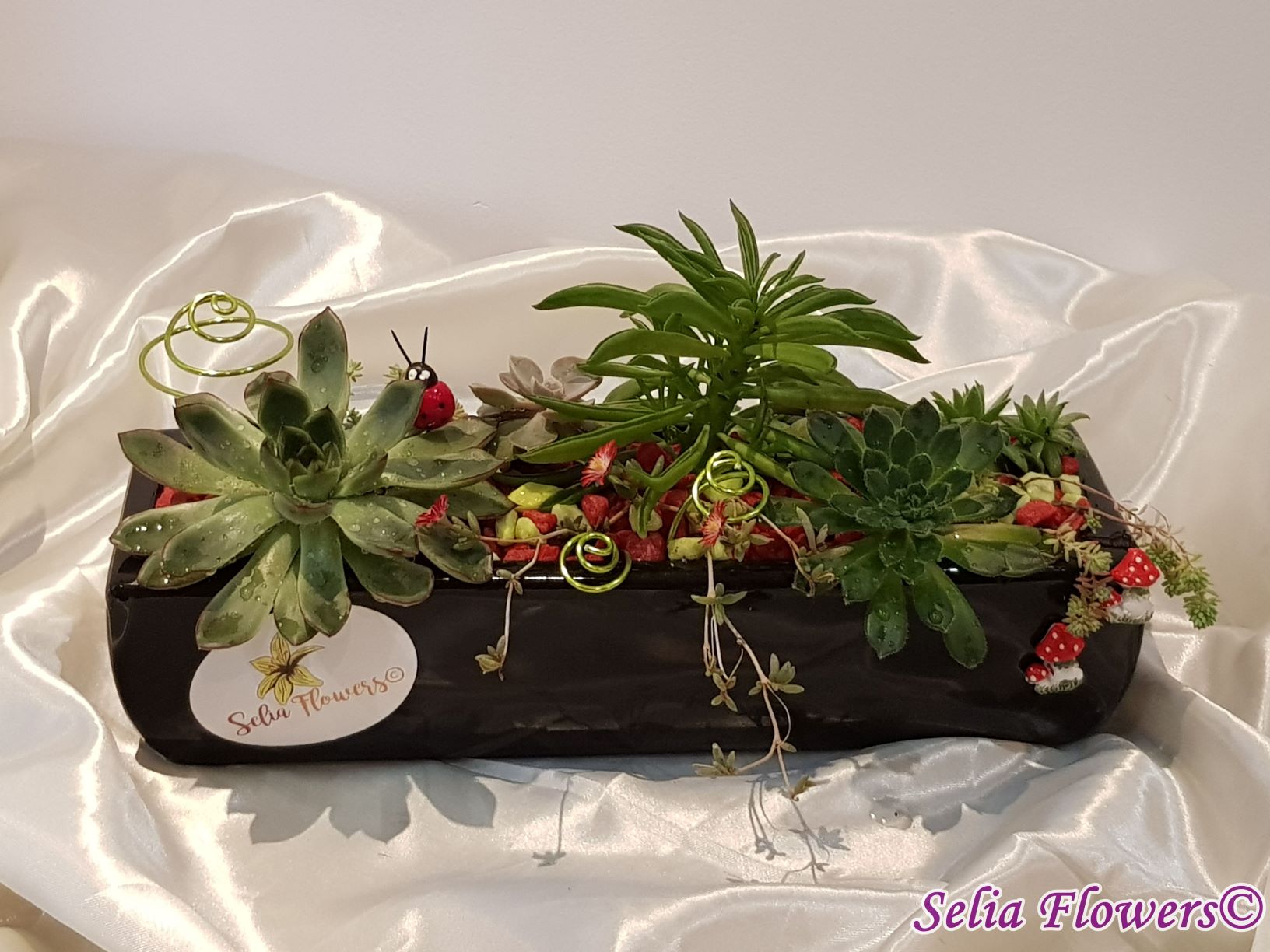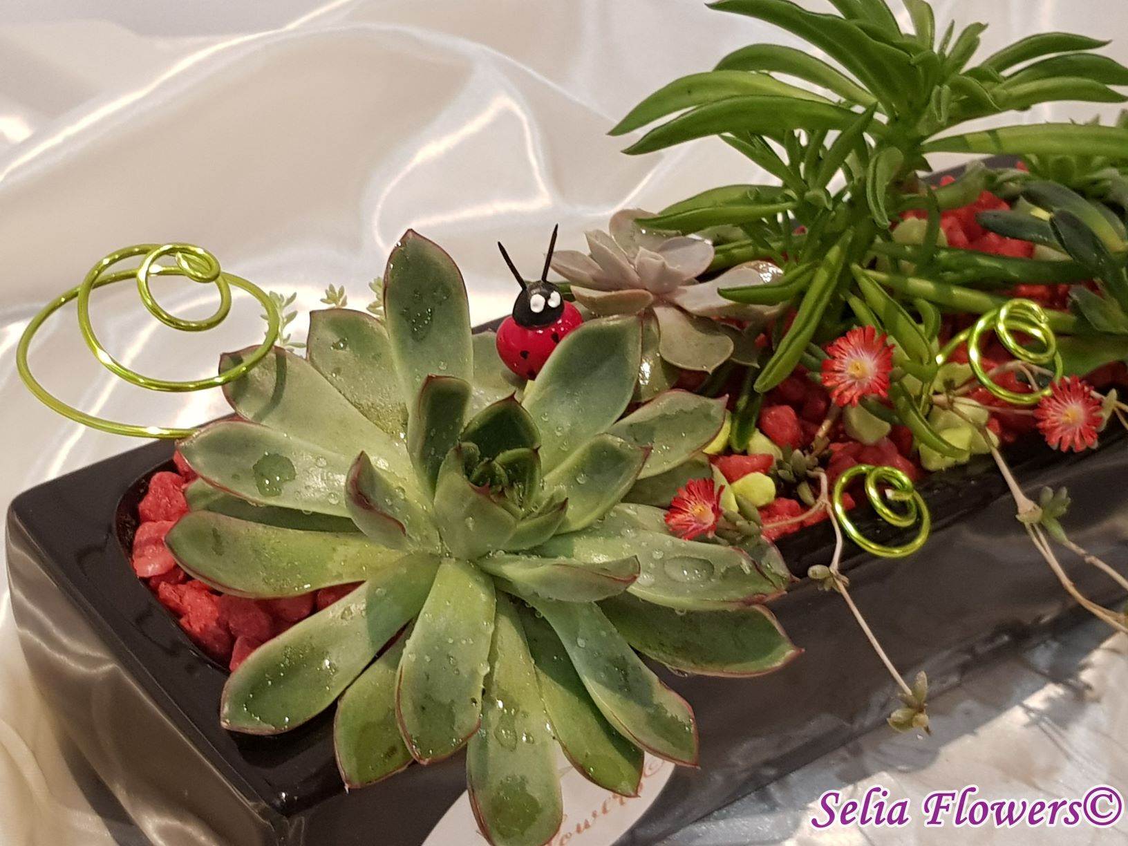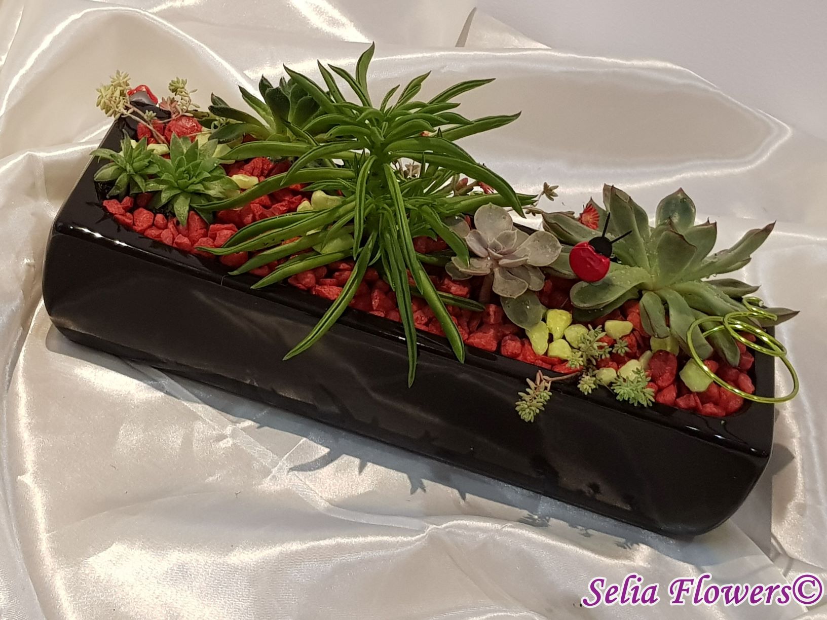 Un aranjament vesel, decorativ și elegant construit în vas ceramic dintr-un mix de plante suculente, accesorii decorative, pietre decorative in doua culori. Potrivit atât ca aranjament de business, dar și pentru a fi daruit unei persoane dragi care se poate bucura mult timp de el de acum inainte.