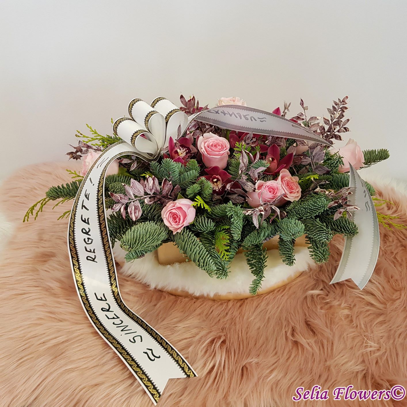 Compozitie: brad nobilis blue, tuia, 12 trandafiri, 10 cupe miniorhidee, ruscus natural stabilizat și vopsit.