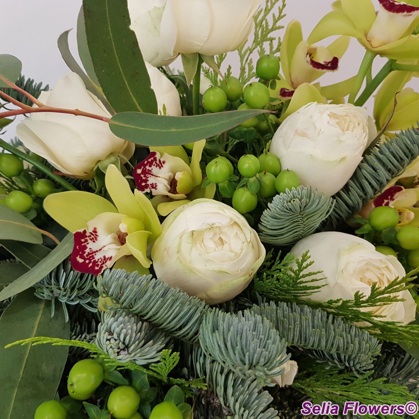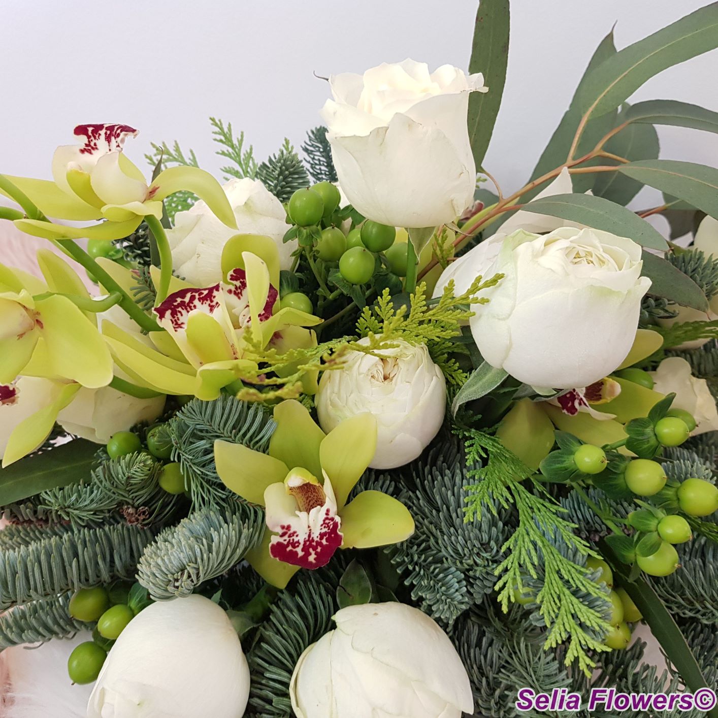 Compozitie: brad nobilis blue, tuia, mix de trandafiri – 20 de fire, 10 cupe miniorhidee, hypericum, eucalypt.