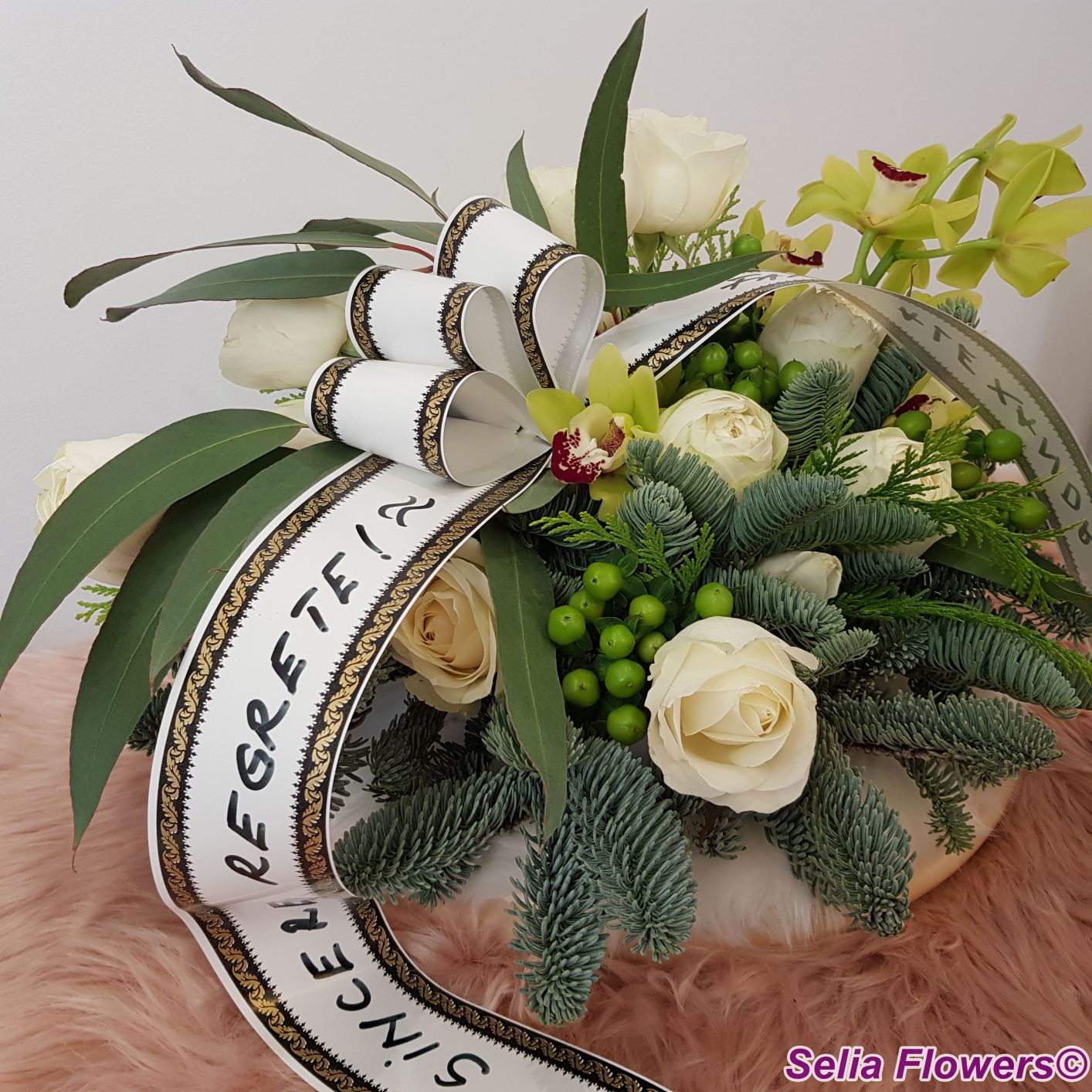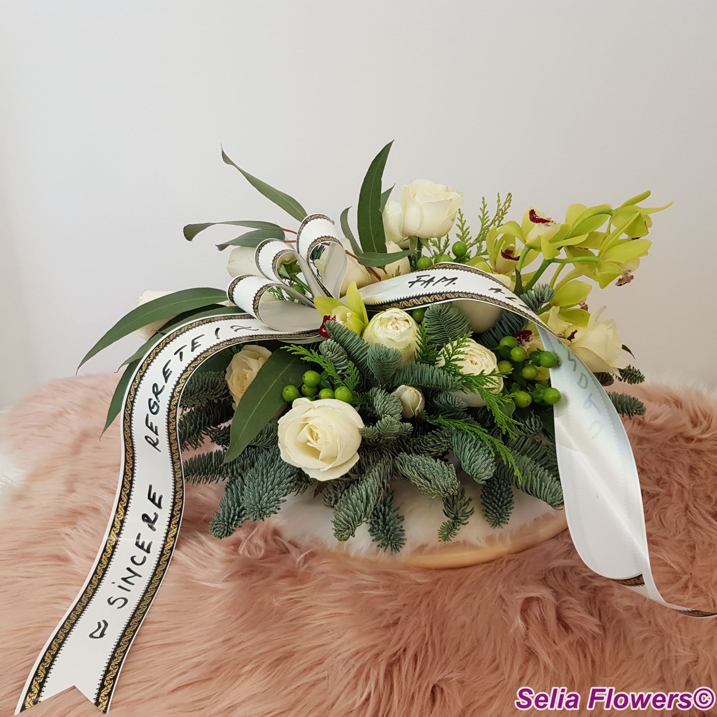 Aranjament funerar realizat pe suport rotund prevăzut cu burete floral umed care asigură hidratarea florilor pe perioadă îndelungată. Dimensiune inițială 20 cm diametru, iar la livrare, aproximativ 50 cm.