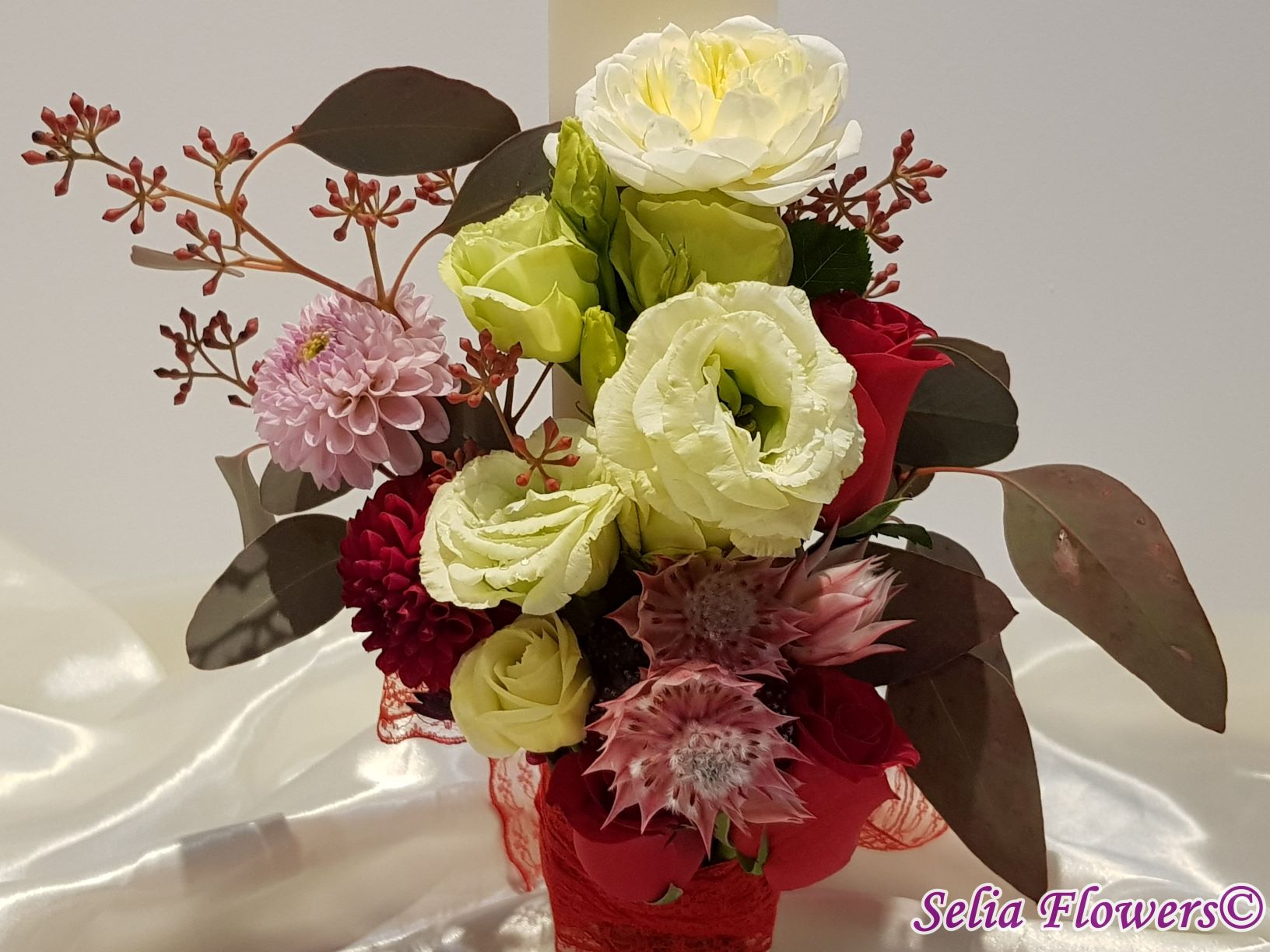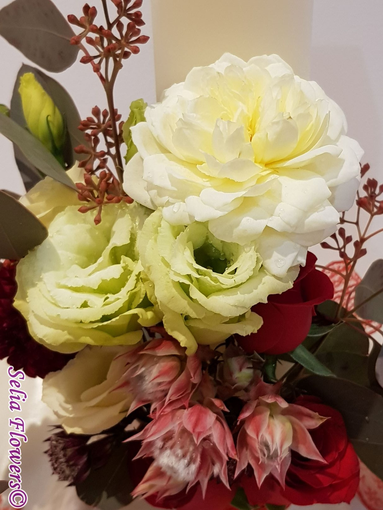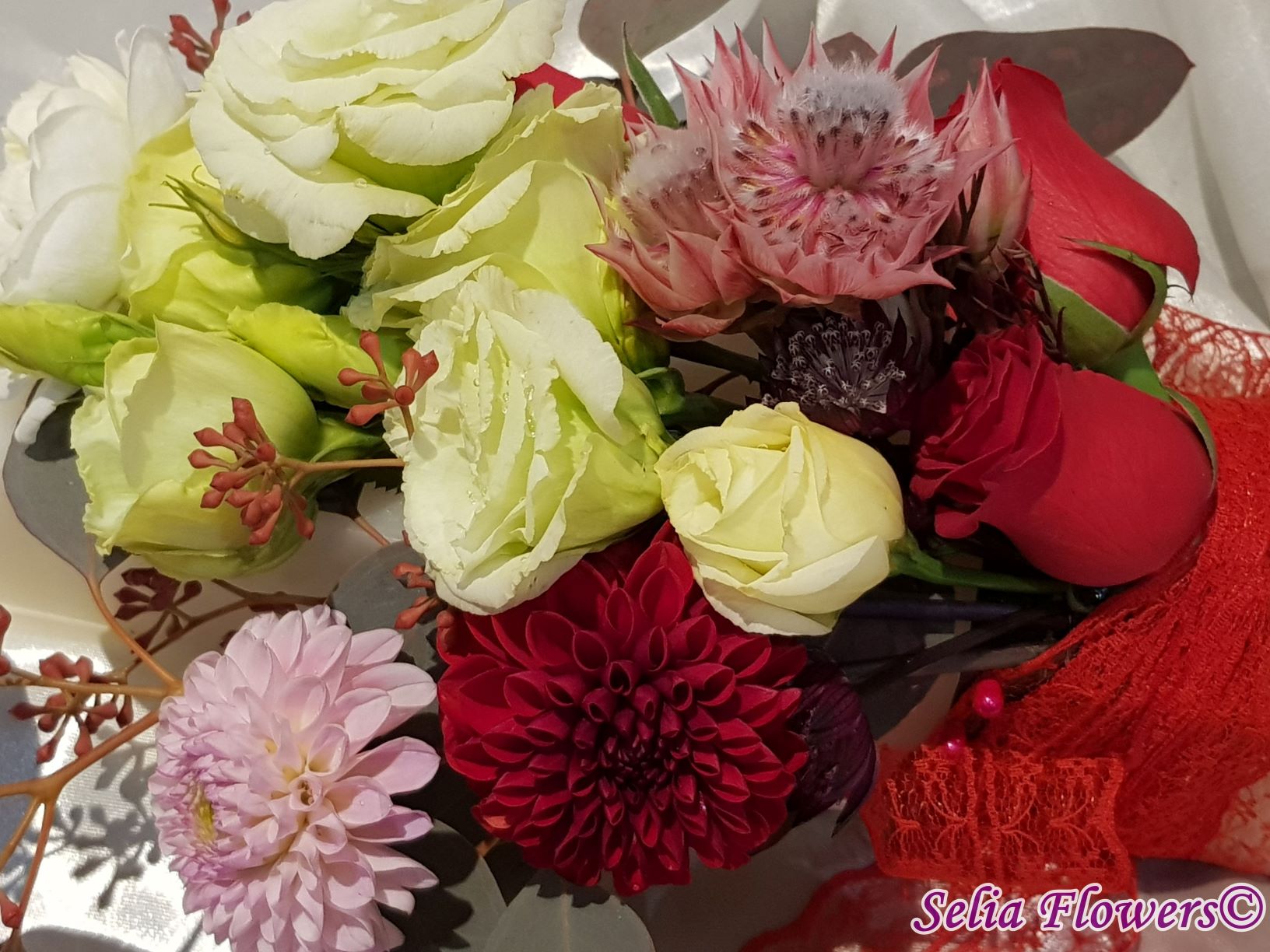 Compoziție florală: trandafiri parfumați de gradină, trandafiri red naomi, lisianthus, serruria, dalii, astrantia, eucalypt populus berry.