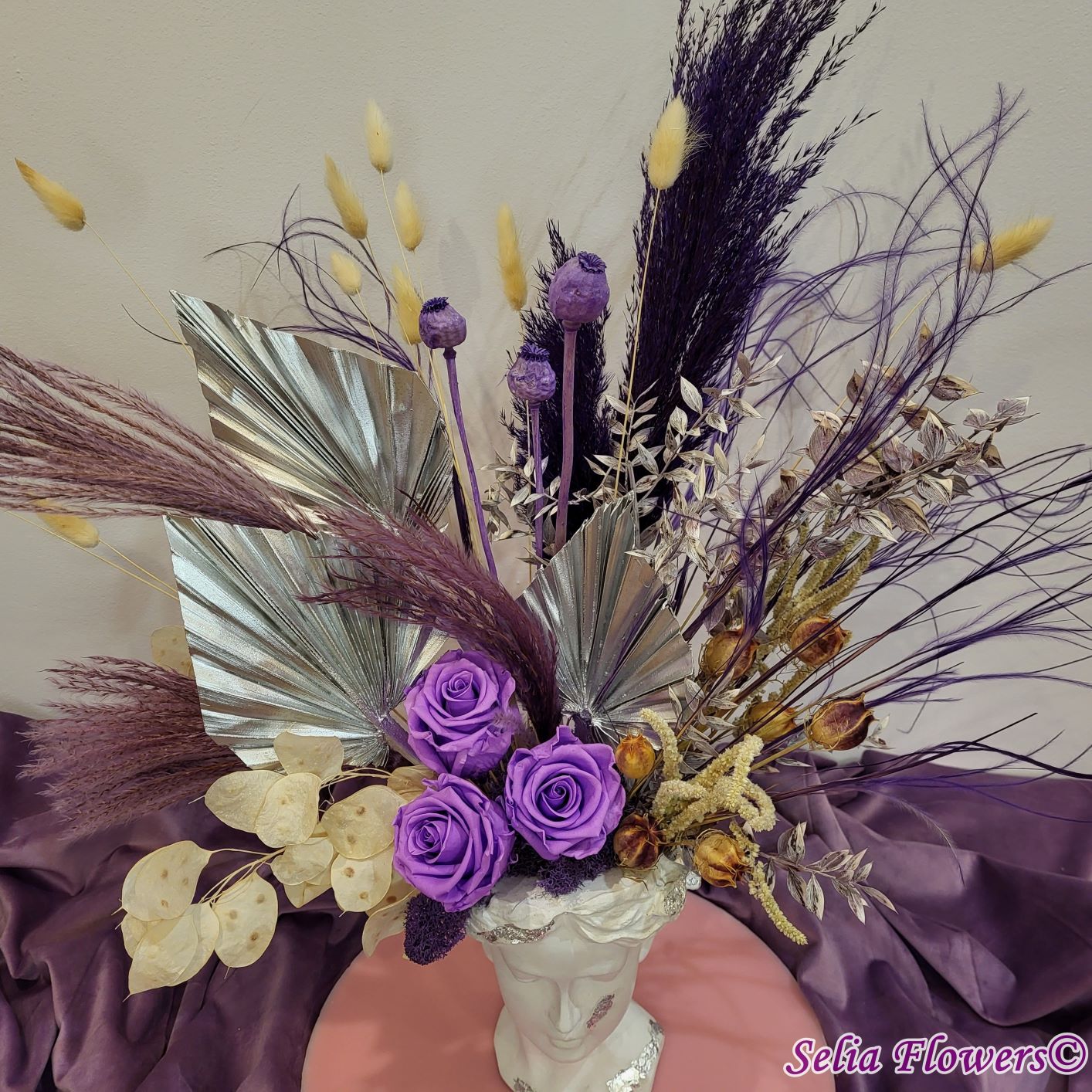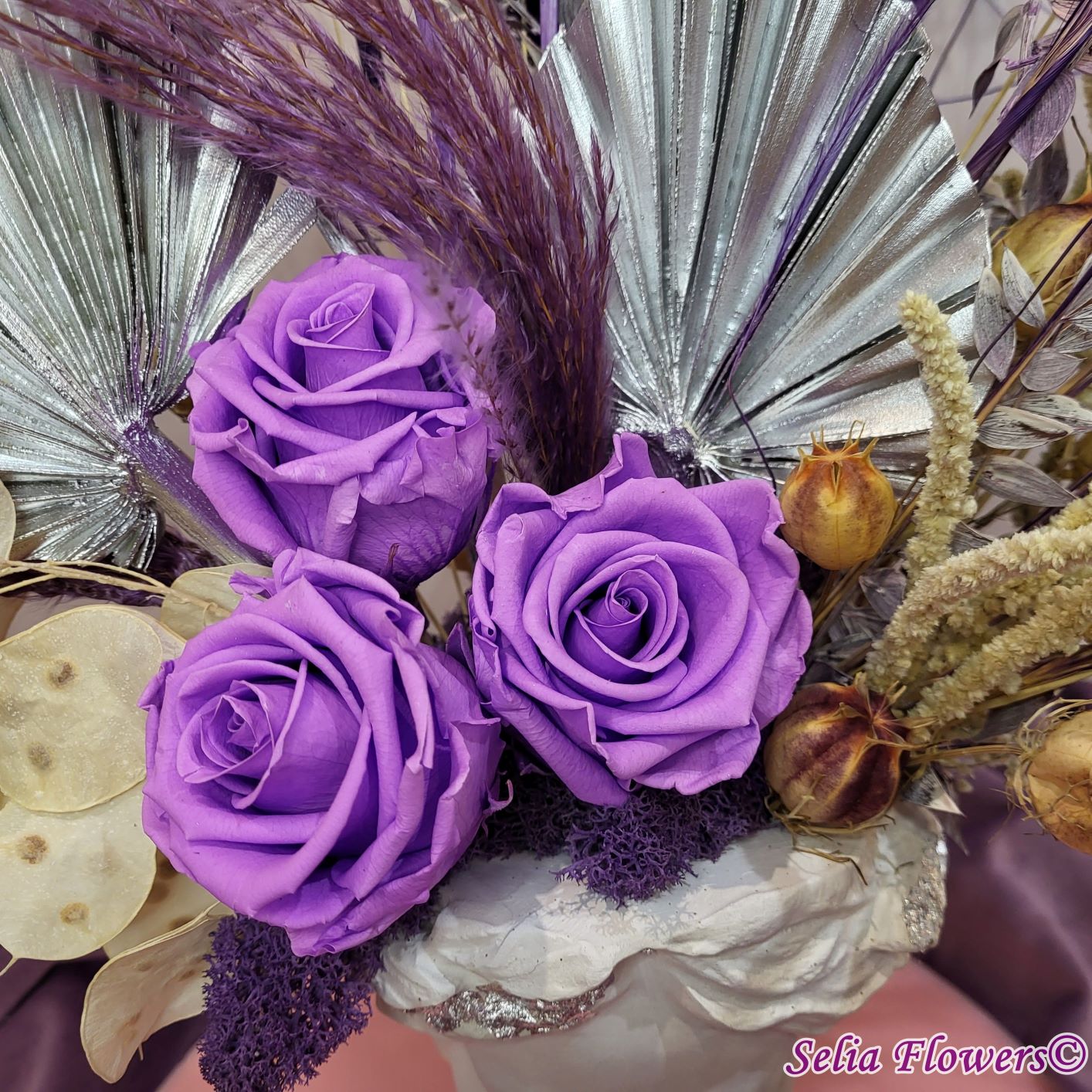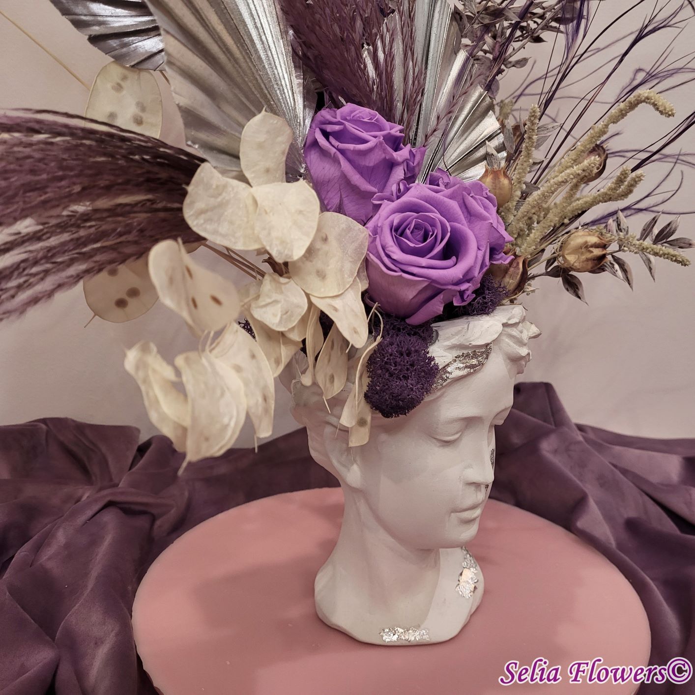 Un aranjament permanent chic, în tonuri de mov, argintiu și crem, construit în vas Venus. Un aranjament care trece cu ușurință proba timpului.