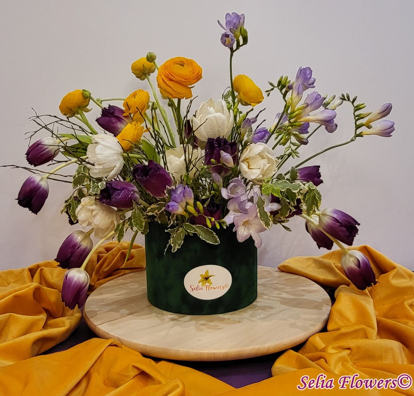 Un aranjament vesel, cu flori de primăvară (ranunculus, lalele, frezii, pittosporum), construit în cutie verde de catifea.