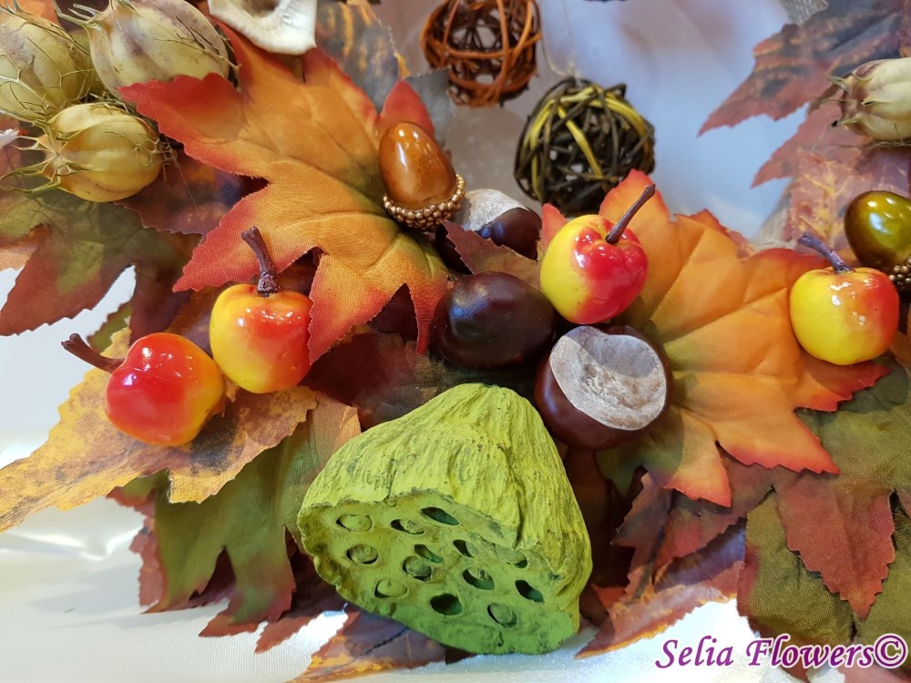 Compozitie: flori naturale uscate sau stabilizate, sfere din ratan, frunze din matase si alte accesorii.