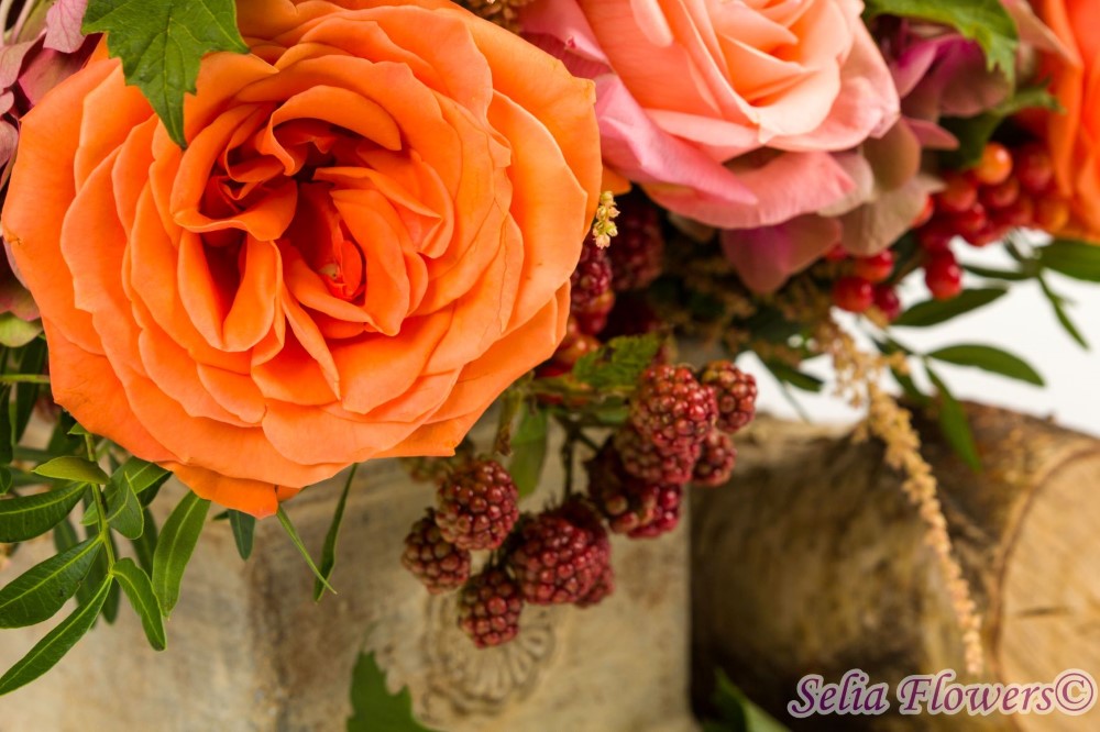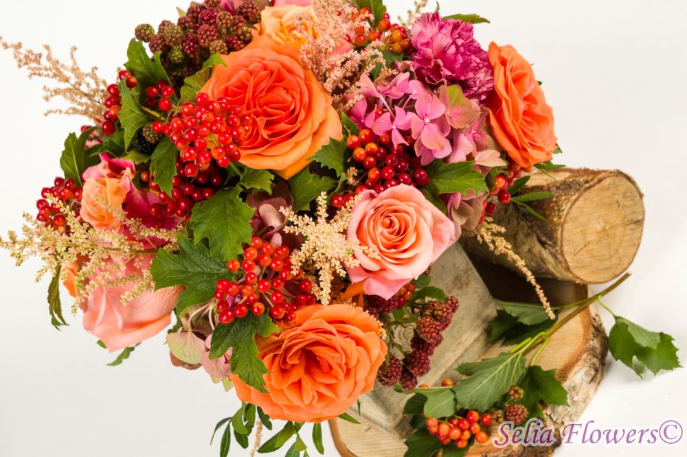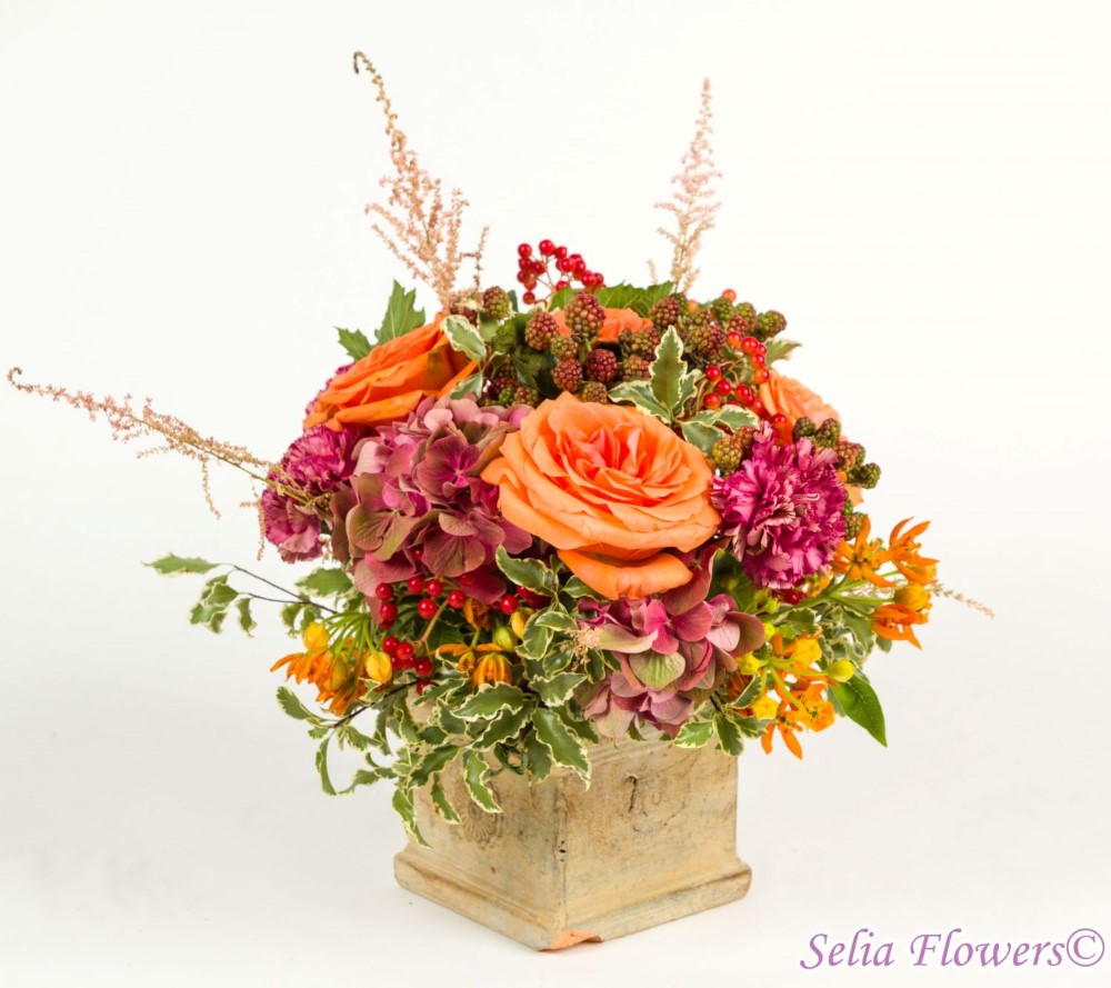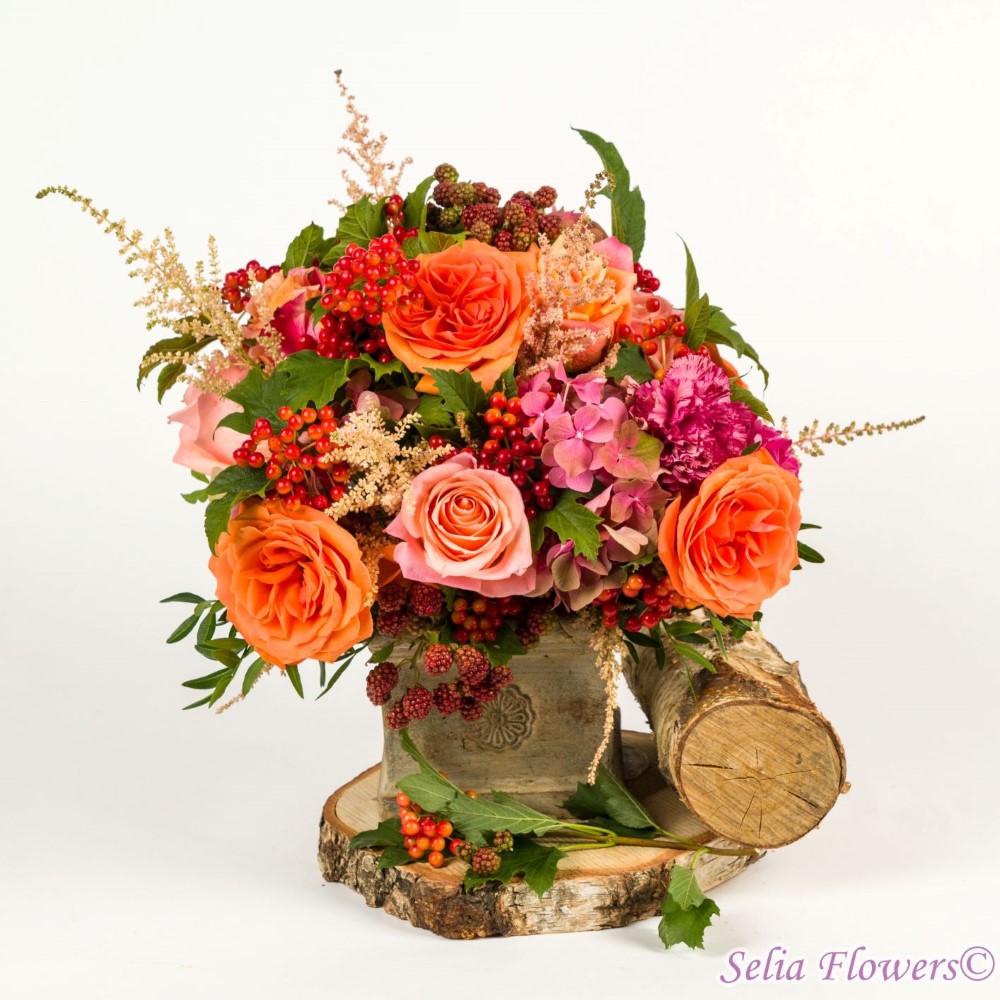 Aranjamente de toamna cu design rustic, construite din flori naturale, in vase antichizate, prevazute cu burete floral umed. Acesta asigura florilor o hidratare perfecta si de durata.