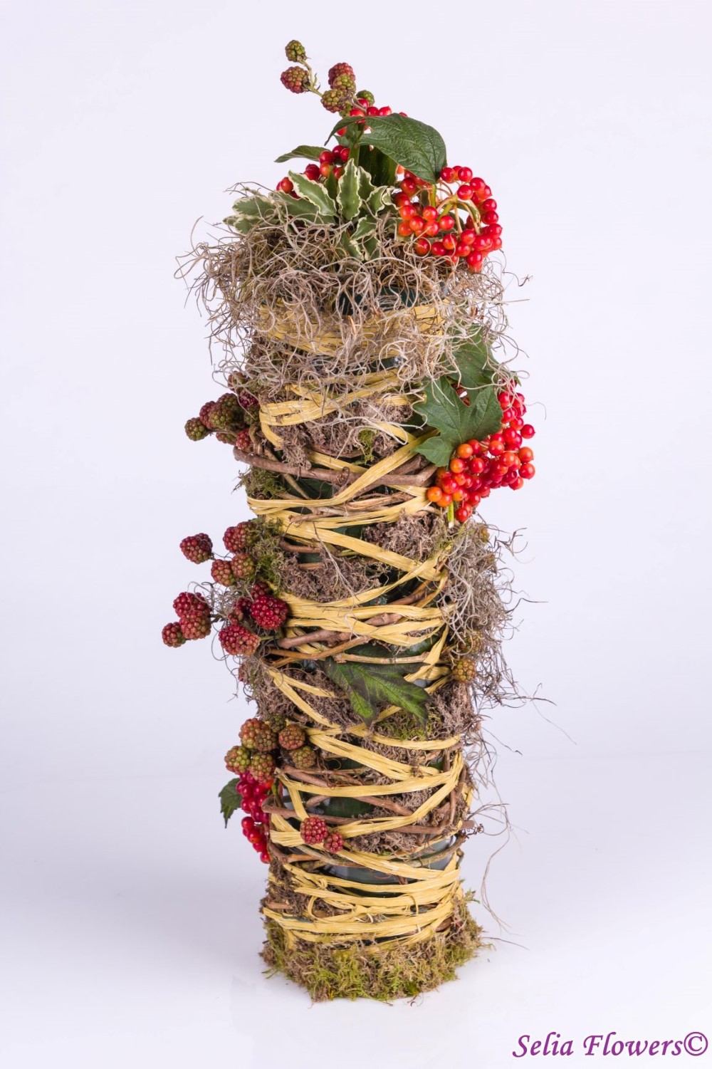 Un decor rustic, realizat pe suport cilindric de sticla, din: pittosporum, crengute de mur, viburnum, tillandsia uscata, muschi.