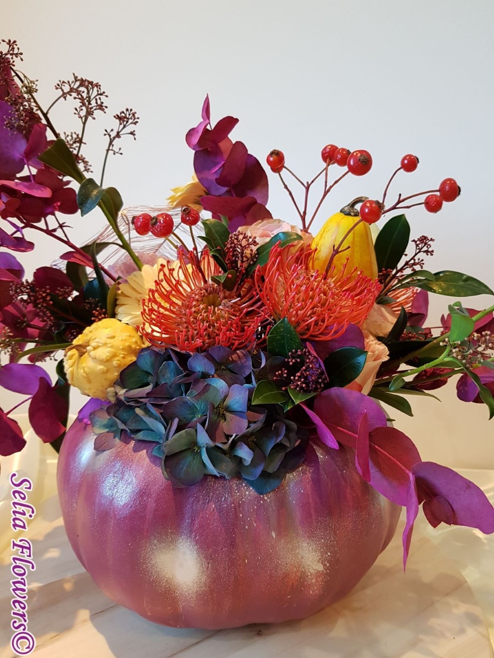 Un dovleac vopsit in doua culori, decorat cu flori naturale si minidovlecei, cu capac realizat cu ajutotul tehnicii spider web.