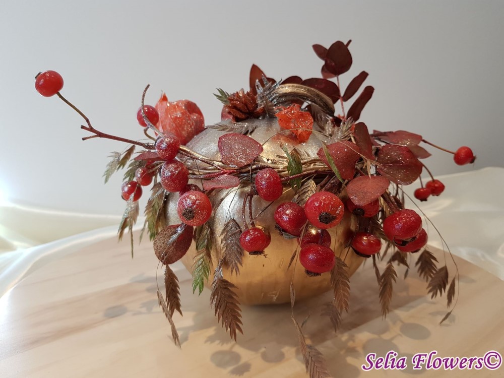 Un dovleac mic si delicat, acoperit cu o mantie aurie, invaluit in stelute colorate si premiat cu o coronita construita din fructe de maces si crengute de eucalypt.