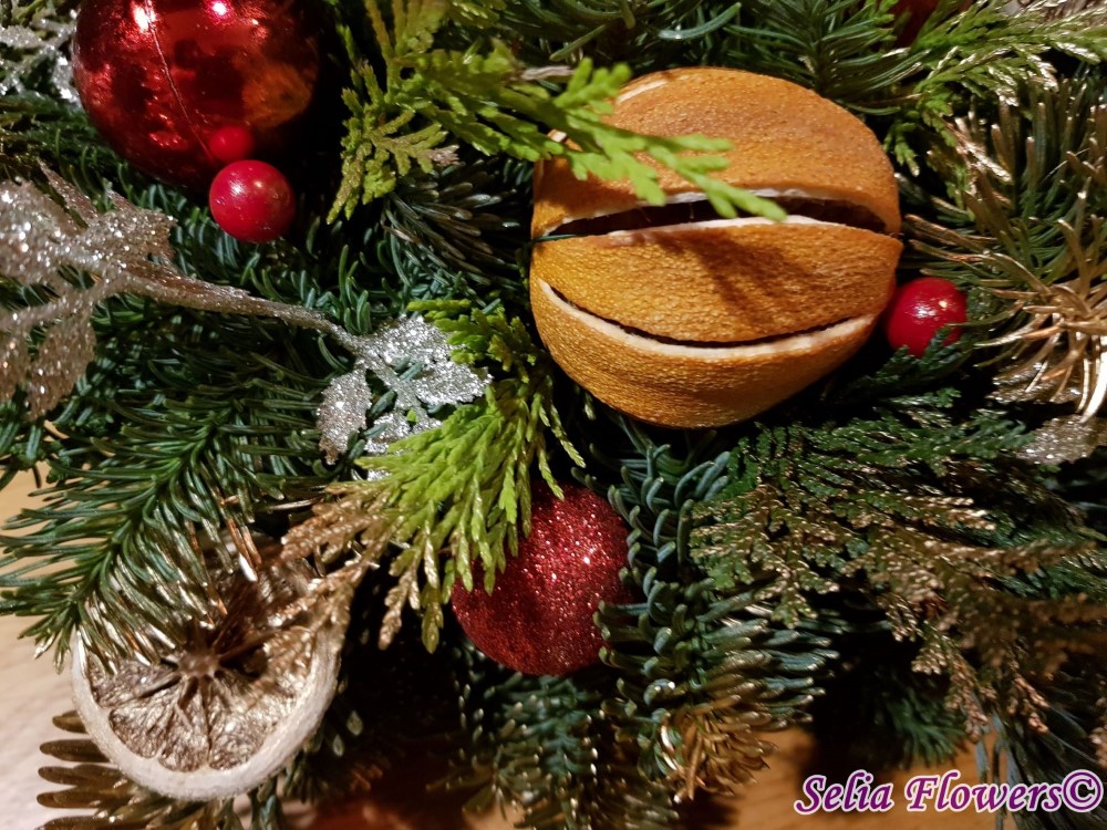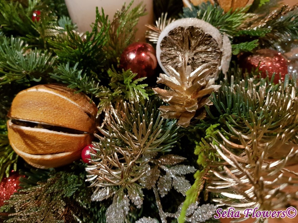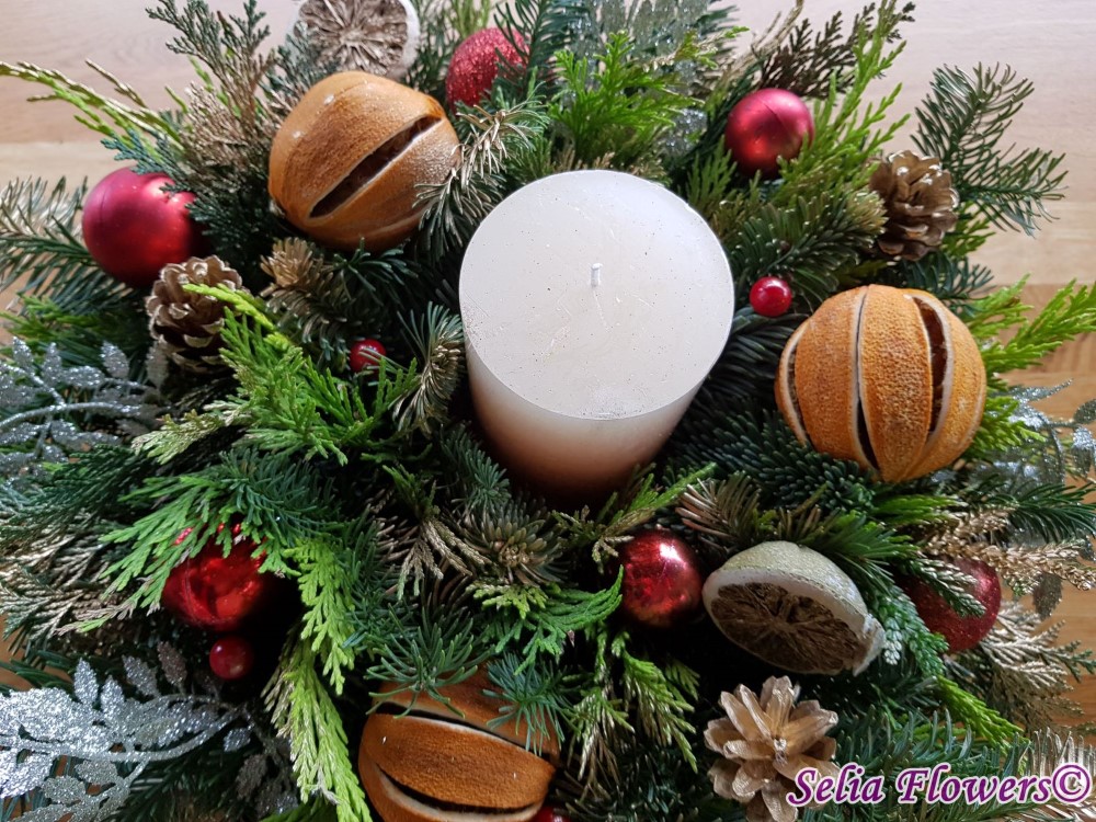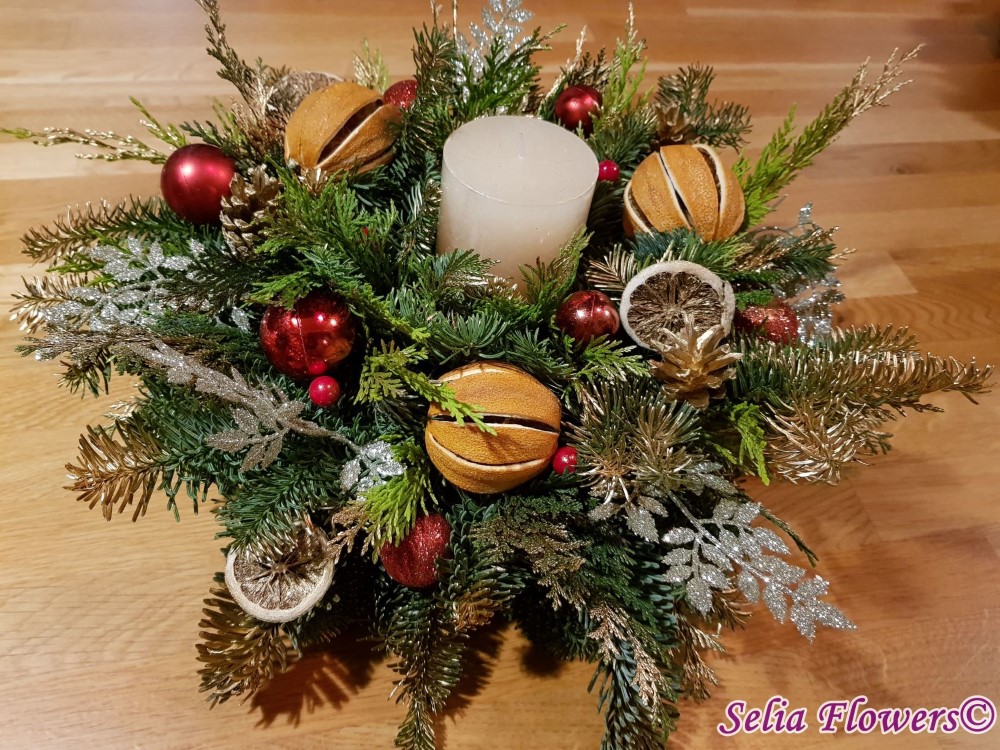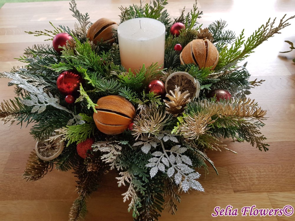 Aranjament de masa realizat cu brad nobil argintiu natural, tuia, globuri, fructe deshidratate, lumanare si alte decoratiuni de iarna.