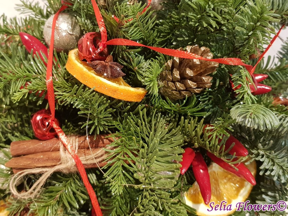 Bradut construit pe suport de burete floral umed, din brad natural argintiu si ardei rosu decorativ. Este accesorizat cu scortisoara, anason si felii deshidratate de portocala, globulete si ghirlanda cu clopotei. Inaltimea aranjamentului este de 45 cm.