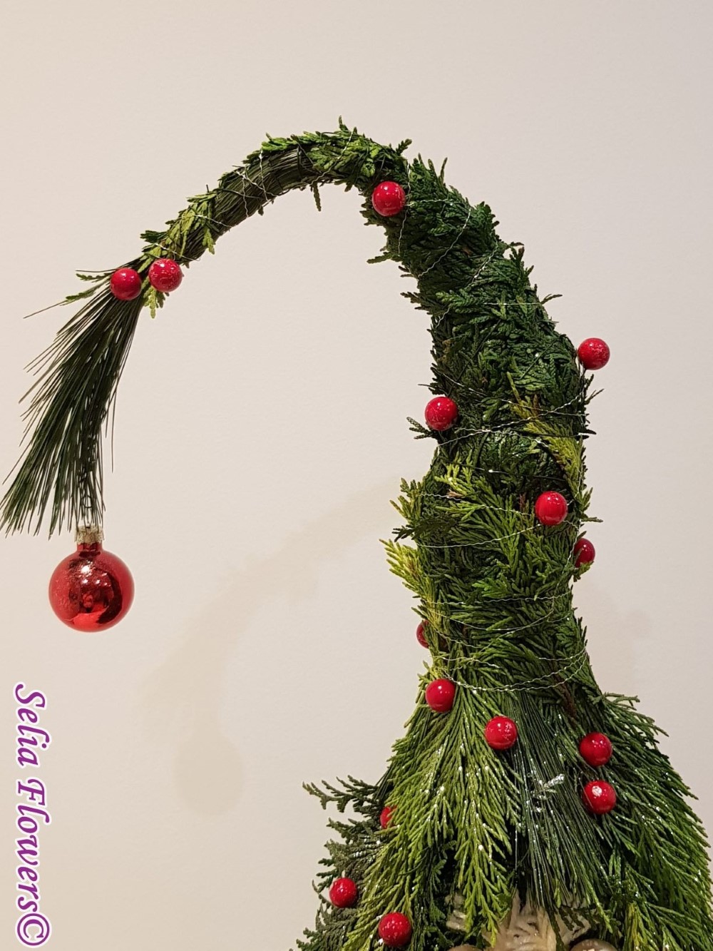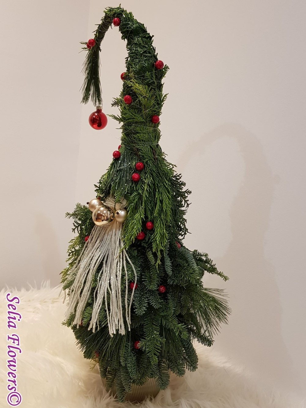 Un altfel de brad natural, realizat handmade din crengute de brad argintiu, pin, tuia, globuri si fir textil. Este construit in suport din ceramica si are o inaltime de aproape 80 cm.