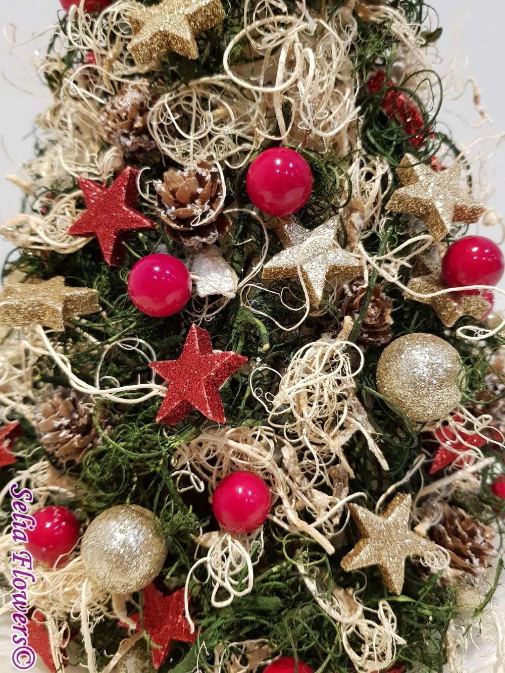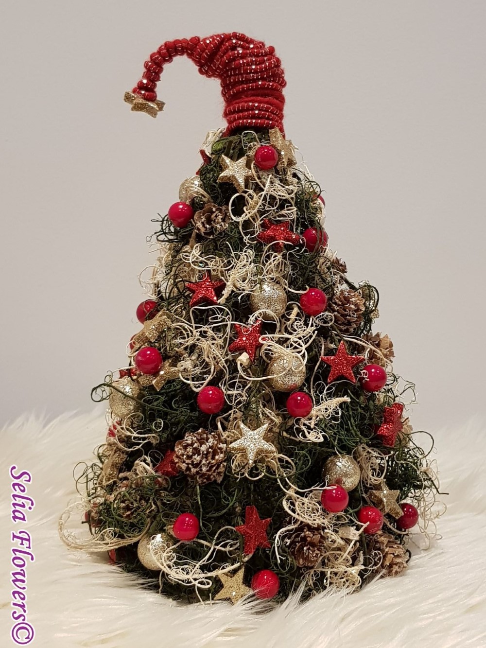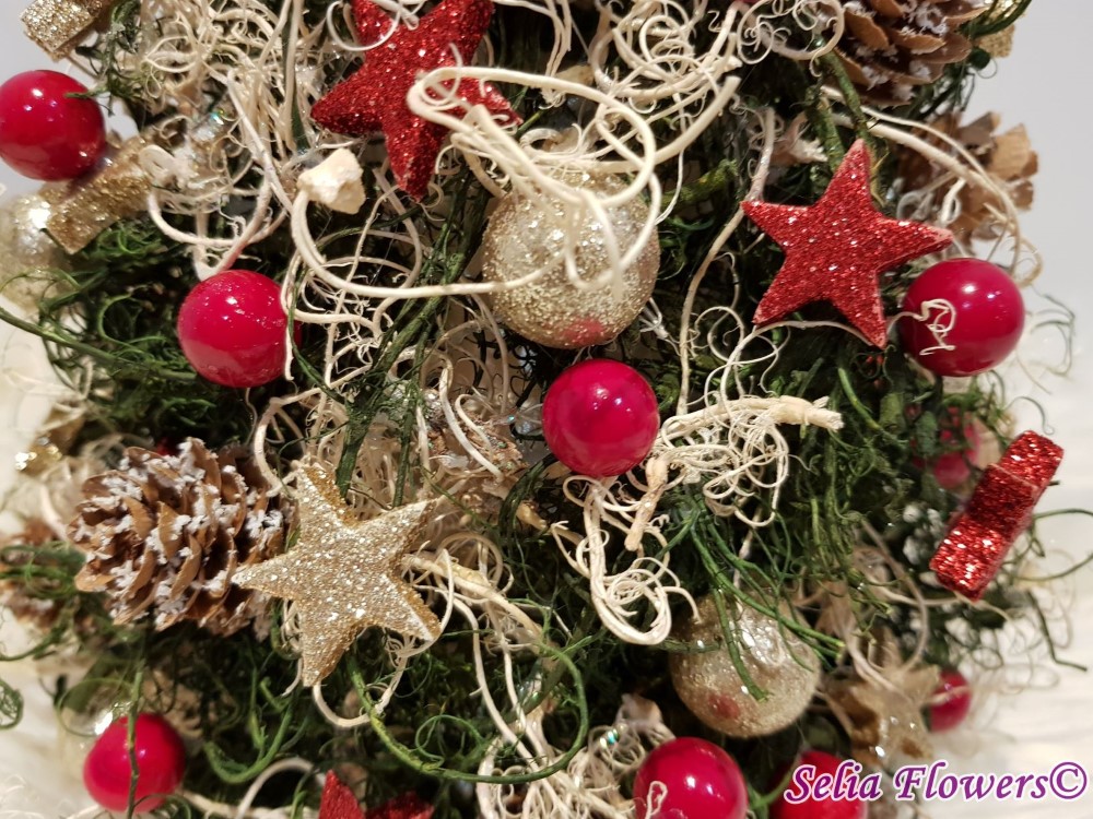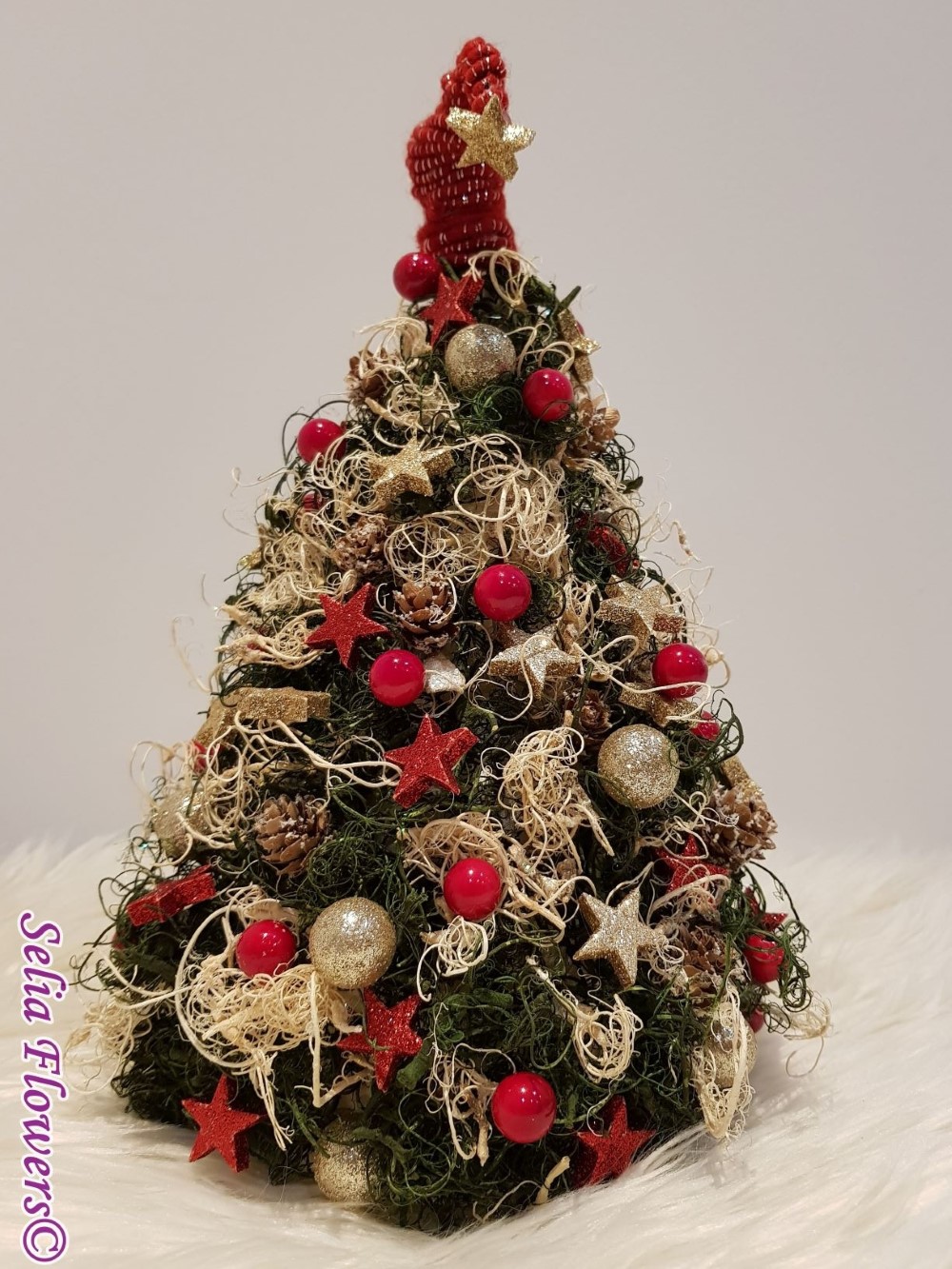 Bradut stilizat handmade, realizat din muschi cret uscat, conuri, lana si decoratiuni de sezon.