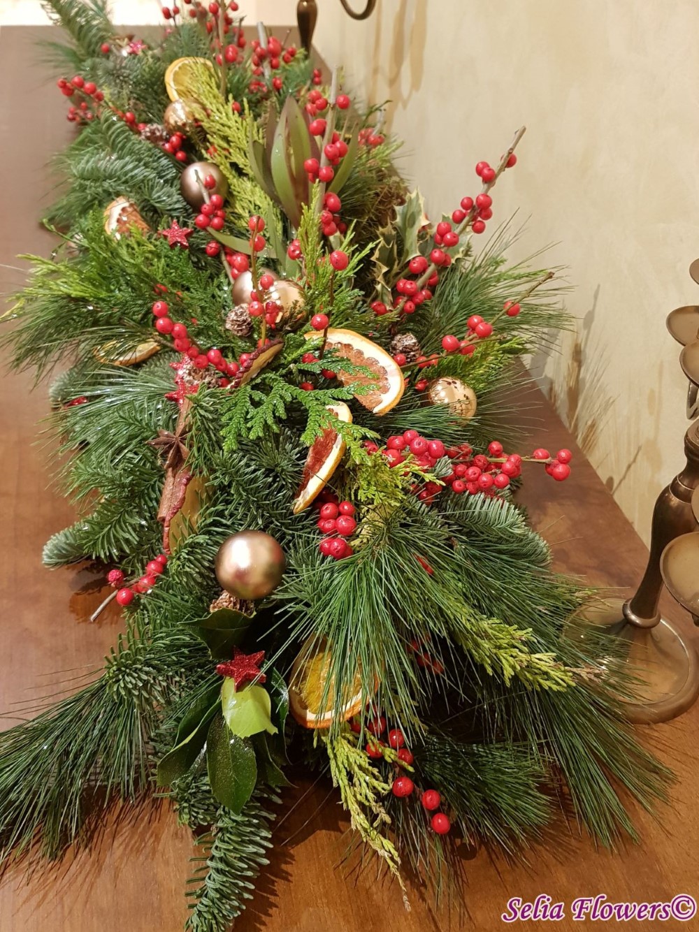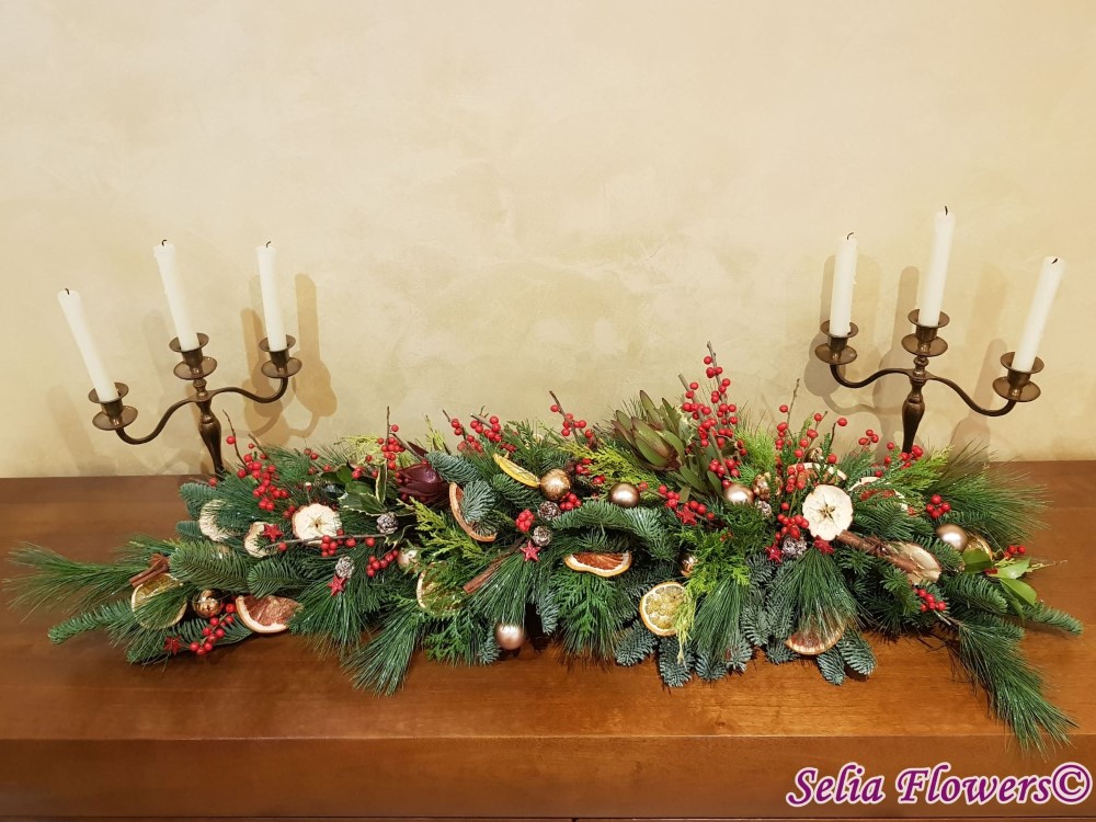 Este foarte potrivit ca decor pentru masa festiva de Craciun sau comoda din livingul tau. Lungimea aranjamentului este de aproximativ un metru .