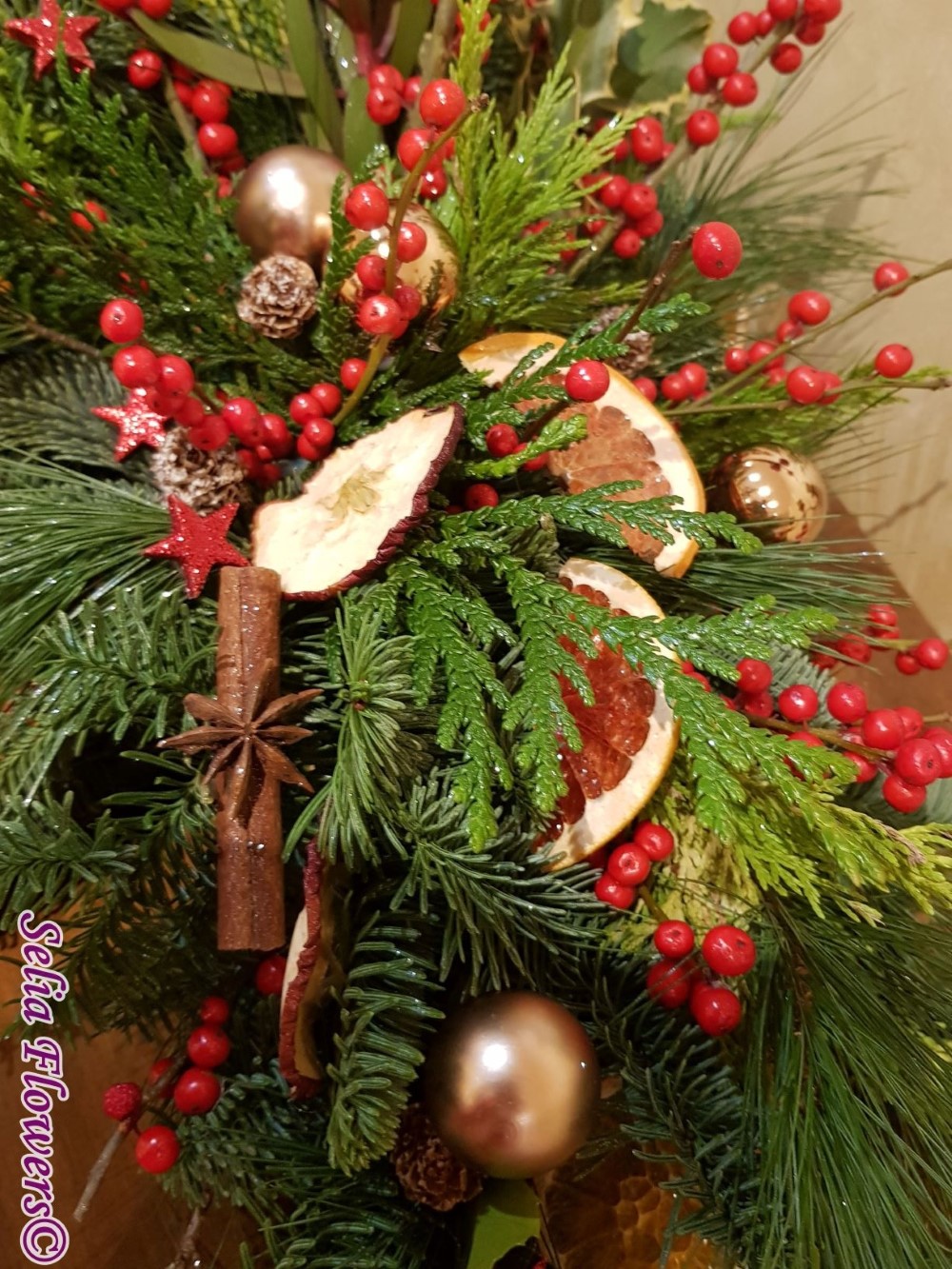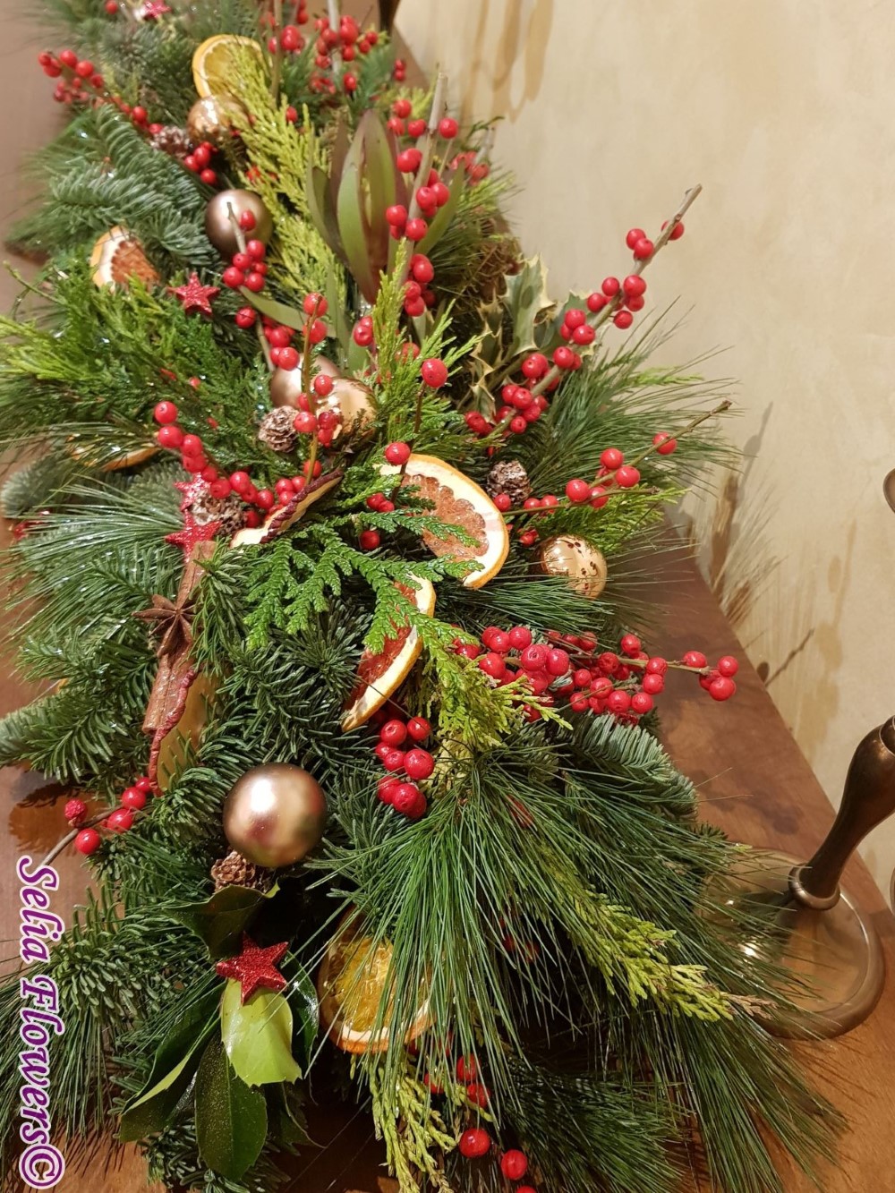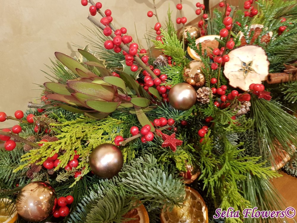 Aranjament elegant tip ghirlanda, construit din mix de conifere , ilex, leucadendron, scortisoara, anason, globulete si mix de fructe deshidratate - grapefruit, mar si portocala.