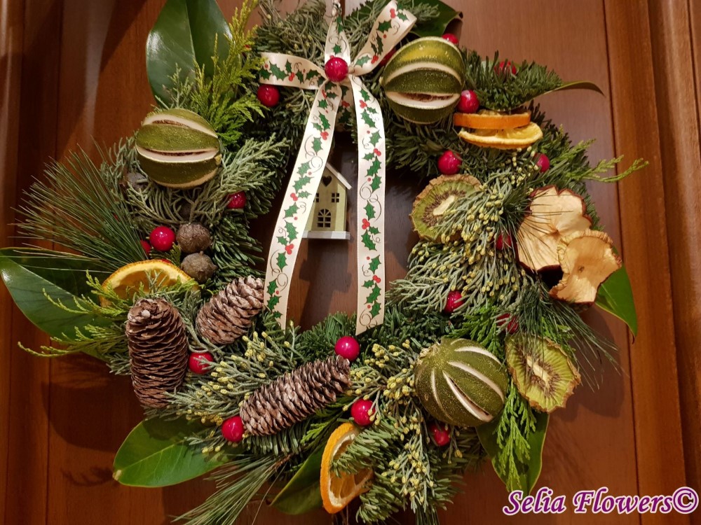 Coronita construita din mix de conifere, fructe deshidratate, conuri de brad, scortisoara, anason si alte elemente de decor. La baza este prevazuta cu doua ghirlande din fructe deshidratate.