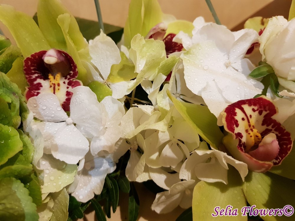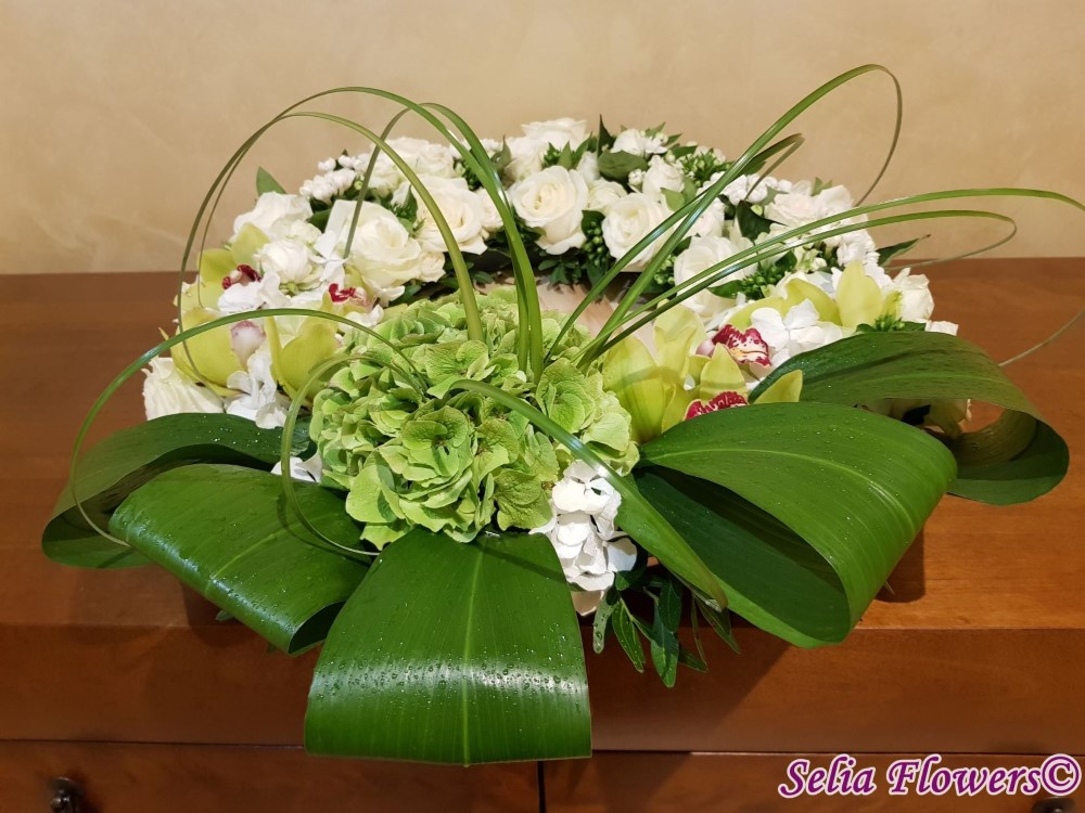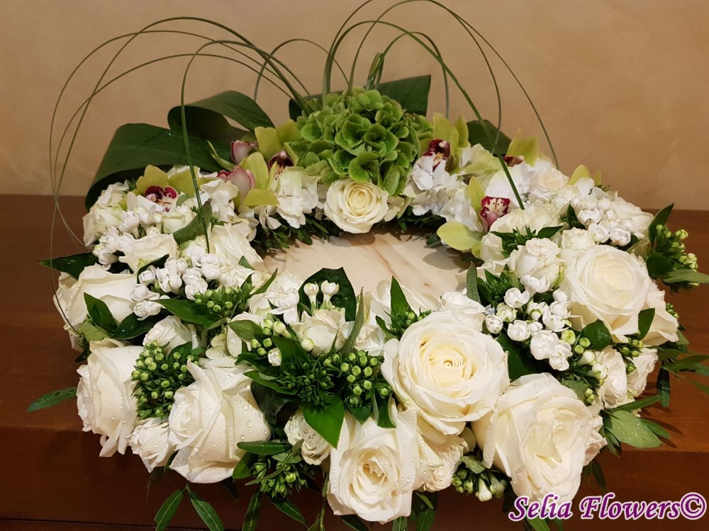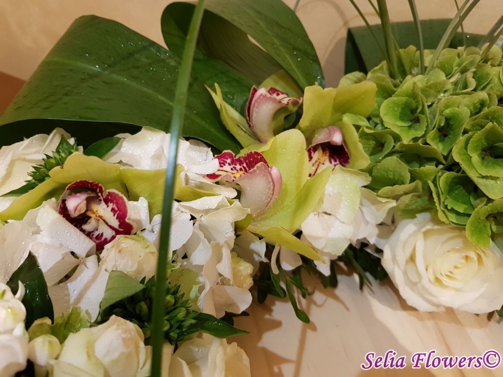 Coroana funerara moderna, cu design elegant, realizata cu trandafiri si minirose albe, hydrangea in doua culori, orhidee cymbidium in doua culori, bouvardia, aspidistra, beargrass, pistache.
