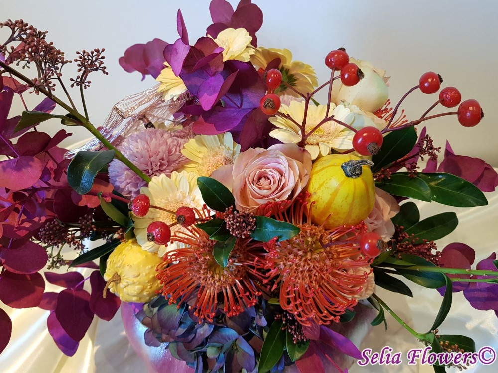 Compozitie: Este decorat cu flori de bumbac, eucalypt vopsit, ruscus stabilizat, hydrangea, trandafiri, leucospermum, germinis, crizanteme, skimmia, macese, crengute de eucalypt vopsit.