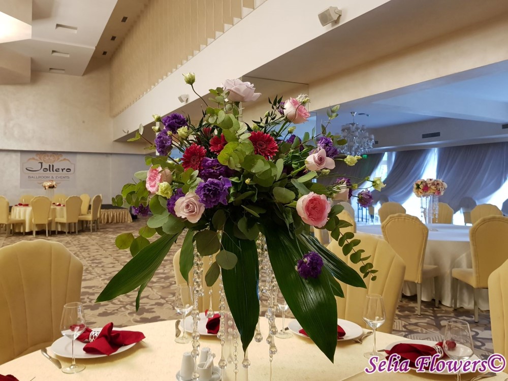 Aranjament centerpiece cu trandafiri, lisianthus, germini, eucalipt, aspidistra