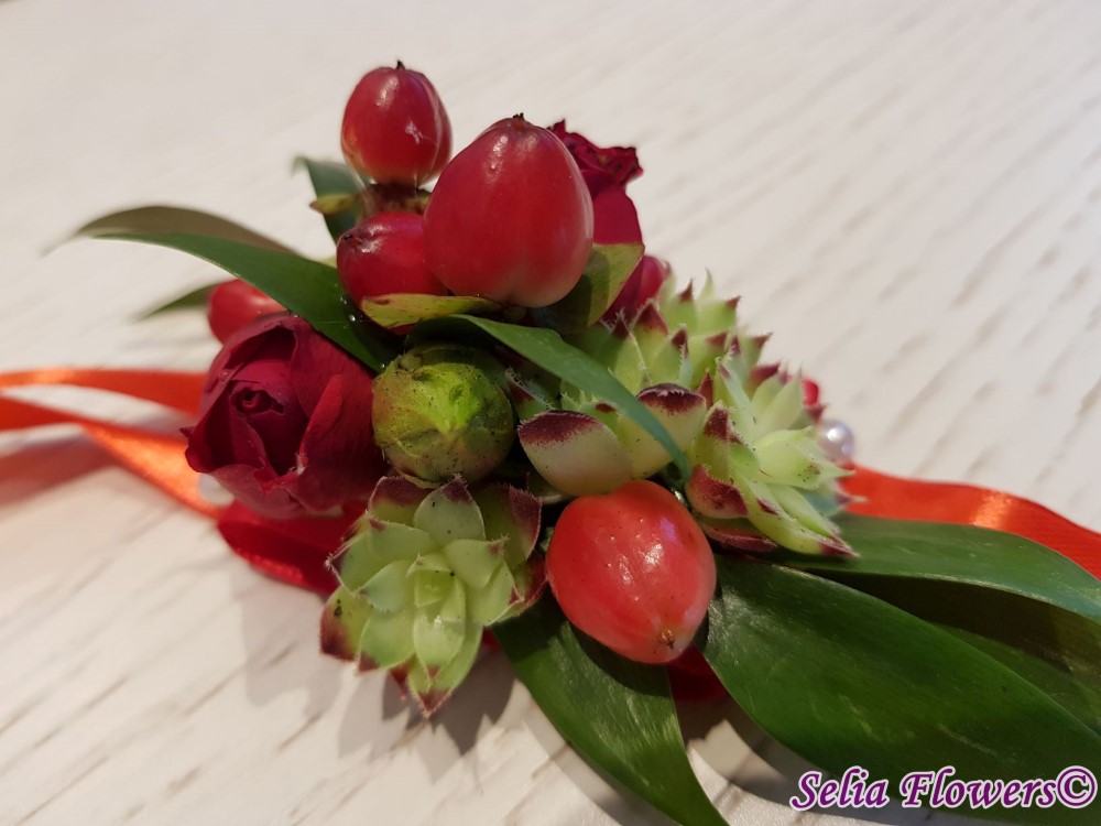 Compozitie: trandafiri tros, plante suculente, celosia.