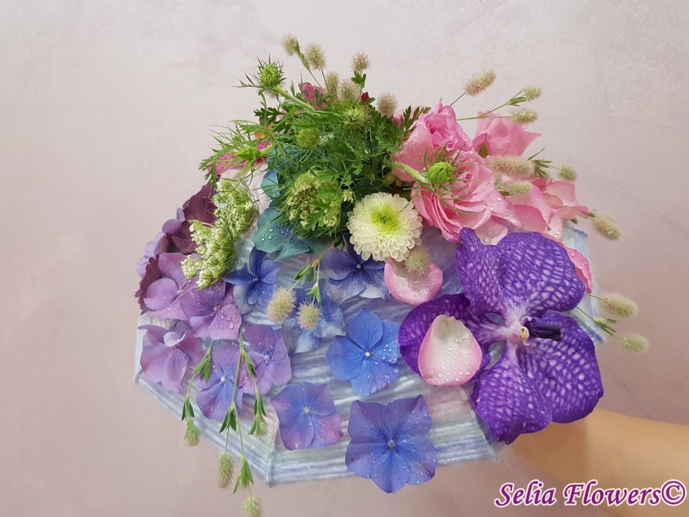 Culorile verii intr-un buchet vesel, realizat pe structura spider, din trandafiri, orhidee vanda, hydrangea, crizanteme si material vegetativ din flora spontana.