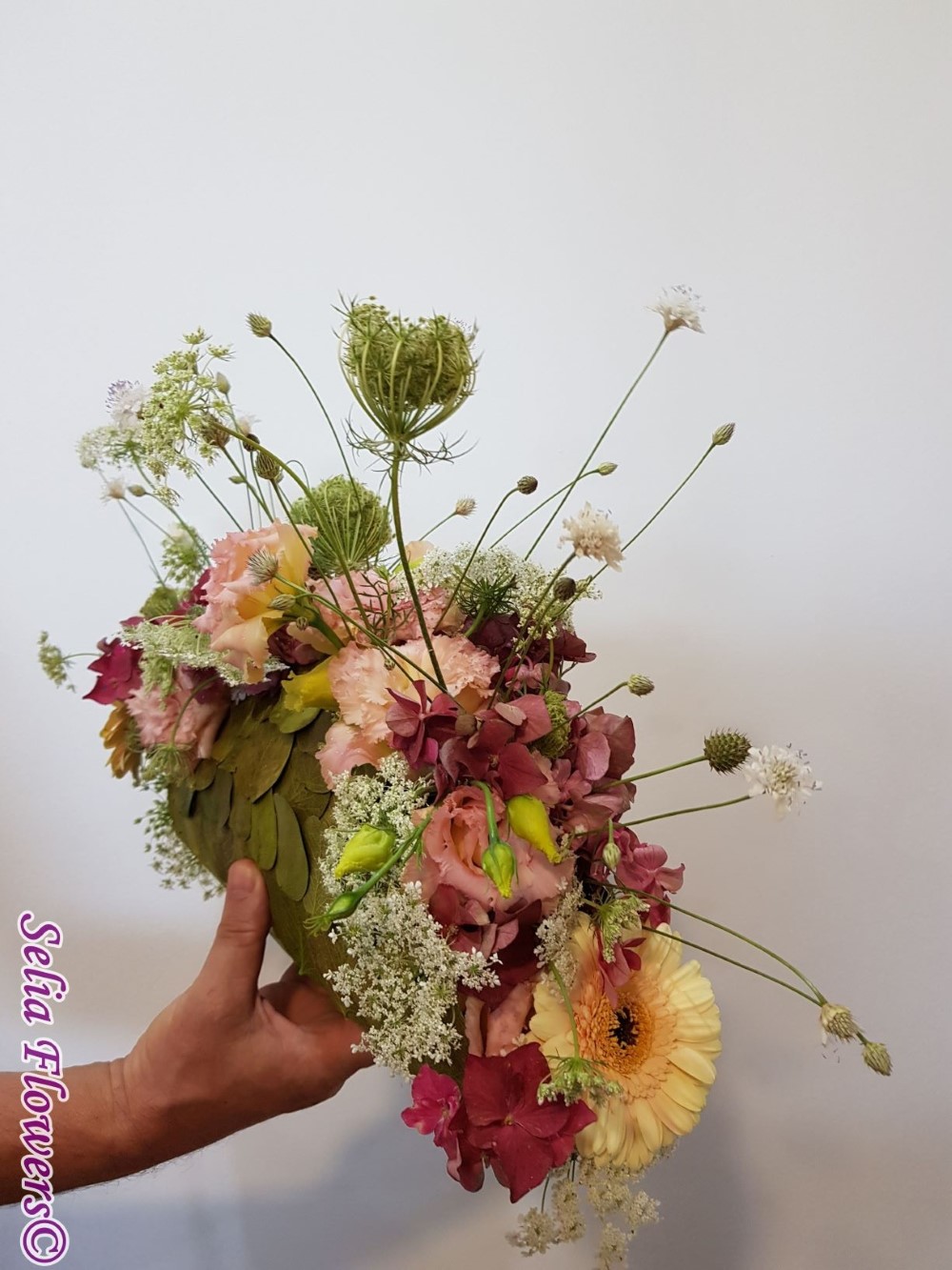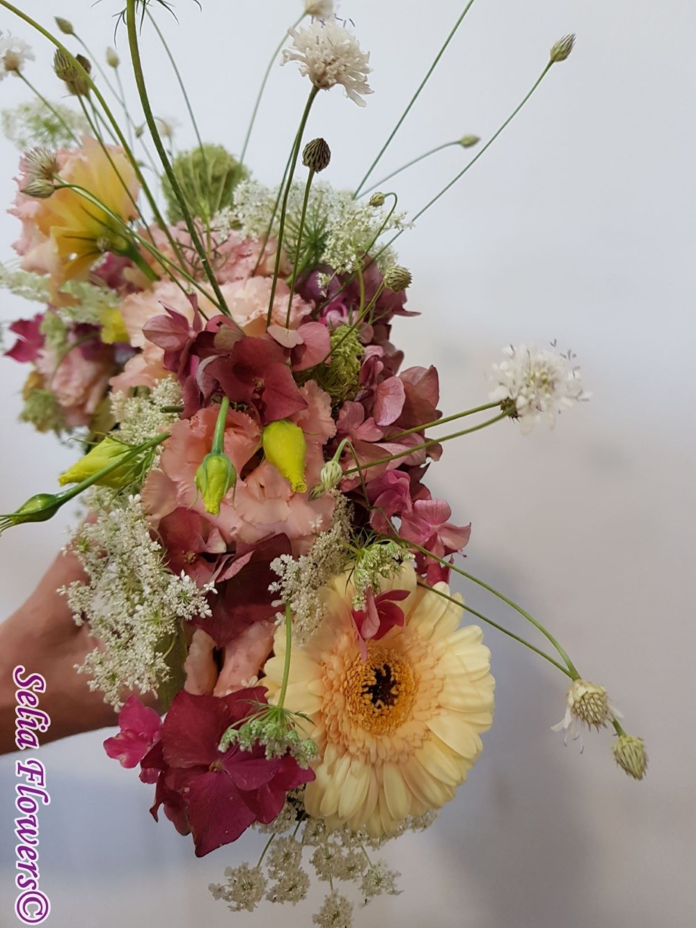 Compozitie: : hydrangea, eustoma, lisianthus, plante din flora spontana.