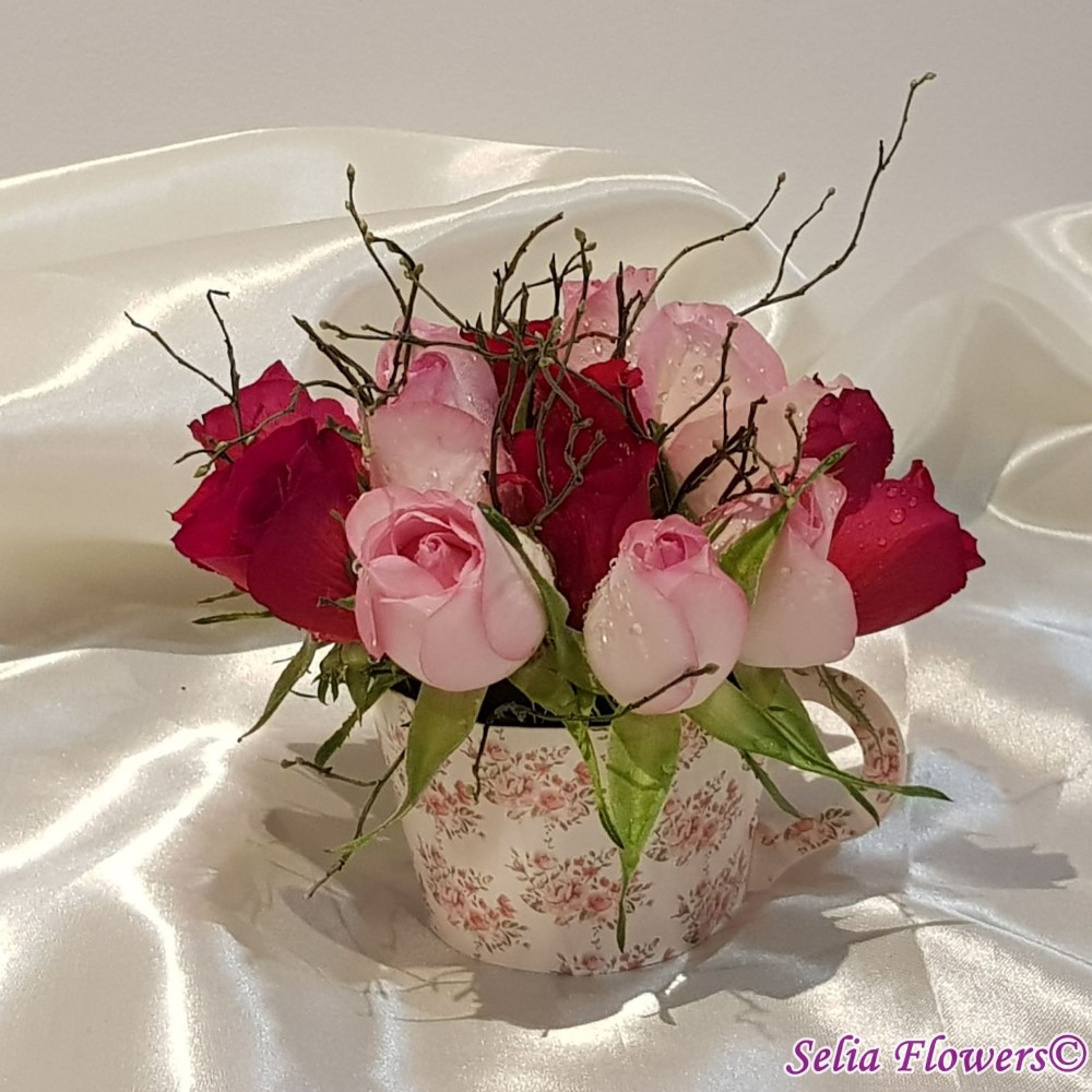 Un martisor original si plin de culoare, care va aduce bucurie si incantare. Este construit din minirose, in cescuta de carton cu model floral (inaltimea cescutei este de 8 cm), prevazuta cu burete umed care asigura hidratarea florilor.