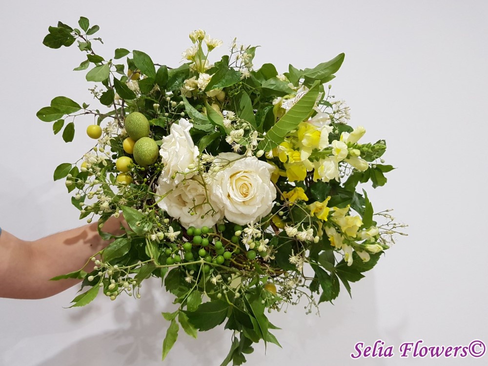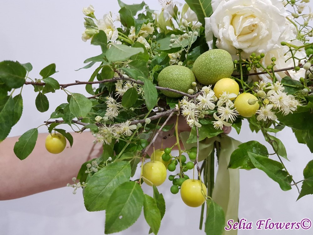 Un buchet de toamna, realizat pe structura de sarma si iedera, construit cu: trandafiri, matthiola, clematis, parthenocissus, fructe de toamna.
