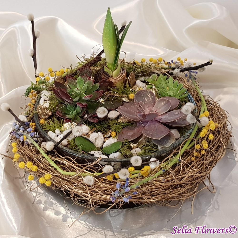 O gradina in miniatura construita in bol rotund din sticla cu plante suculente, amaryllis roz si muschi natural. Aranjamentul este decorat cu pietricele de marmura decorativa si fasii de lemn vopsite. O coronita eleganta, construita din crengute naturale uscate si decorate cu flori uscate de muscari, mimosa si crengute de salix, inconjoara bolul pe toata circumferinta lui.