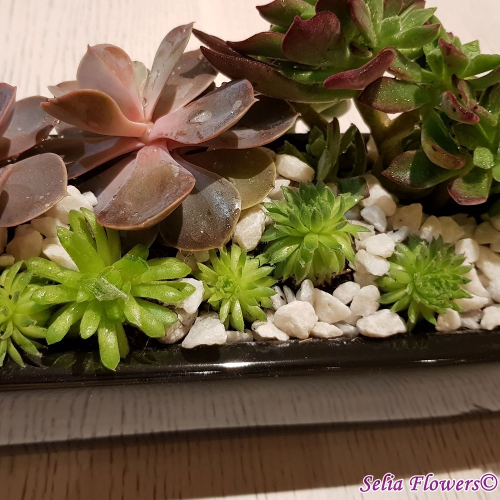 O gradina vesela in miniatura construita intr-un vas elegant din ceramica dintr-un mix de plante suculente. Aranjamentul este decorat cu pietricele de marmura decorativa. Este un aranjament vesel, decorativ si deloc pretentios. Daca adori calatoriile sau esti plecat mai mult timp de acasa, reprezinta florile ideale, deoarece rezista destul de mult timp fara sa fie udate.