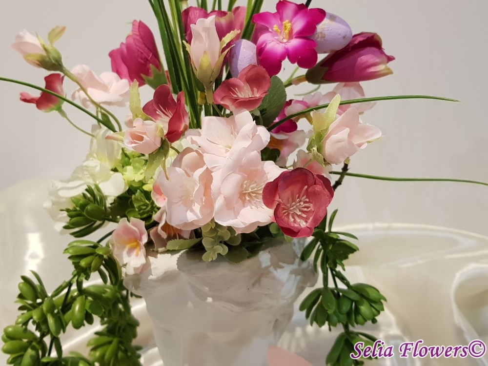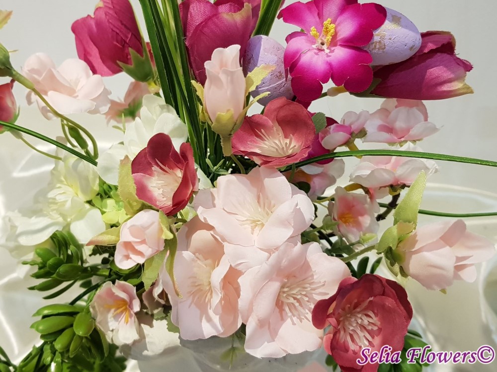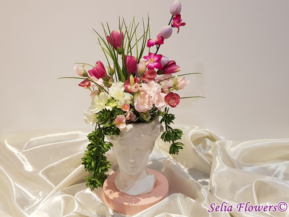 Un aranjament permanent construit în vază Venus cu flori din mătase (iris, narcise, crenguță de cireș), planta artificială real touch și crenguță cu decor pascal.