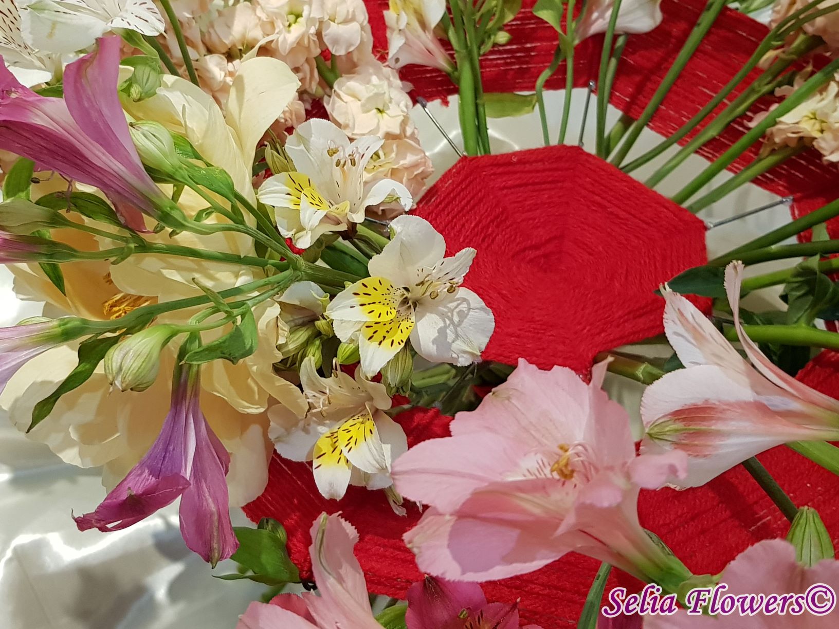 Un buchet elegant, vesel si parfumat, construit pe structura spider web din 15 fire de alstroemeria, bujori si mathiola.