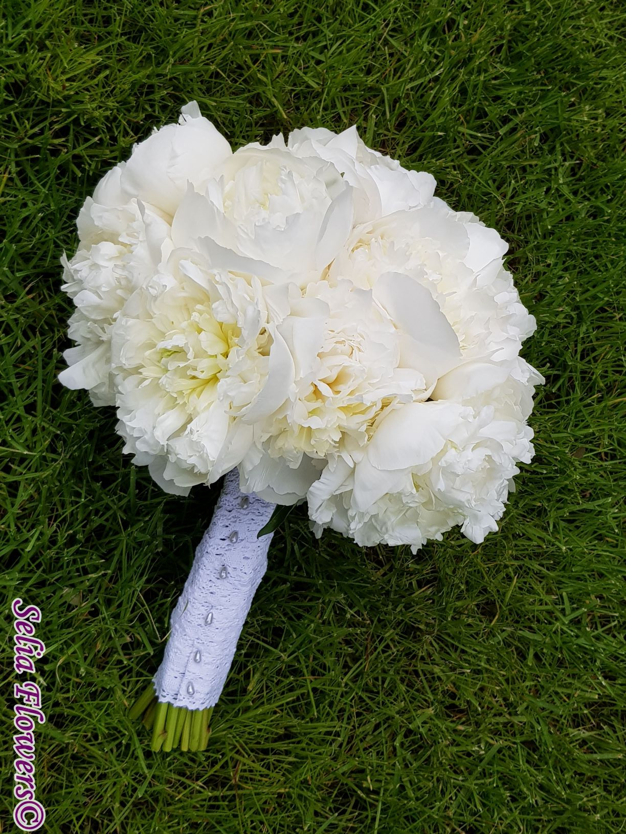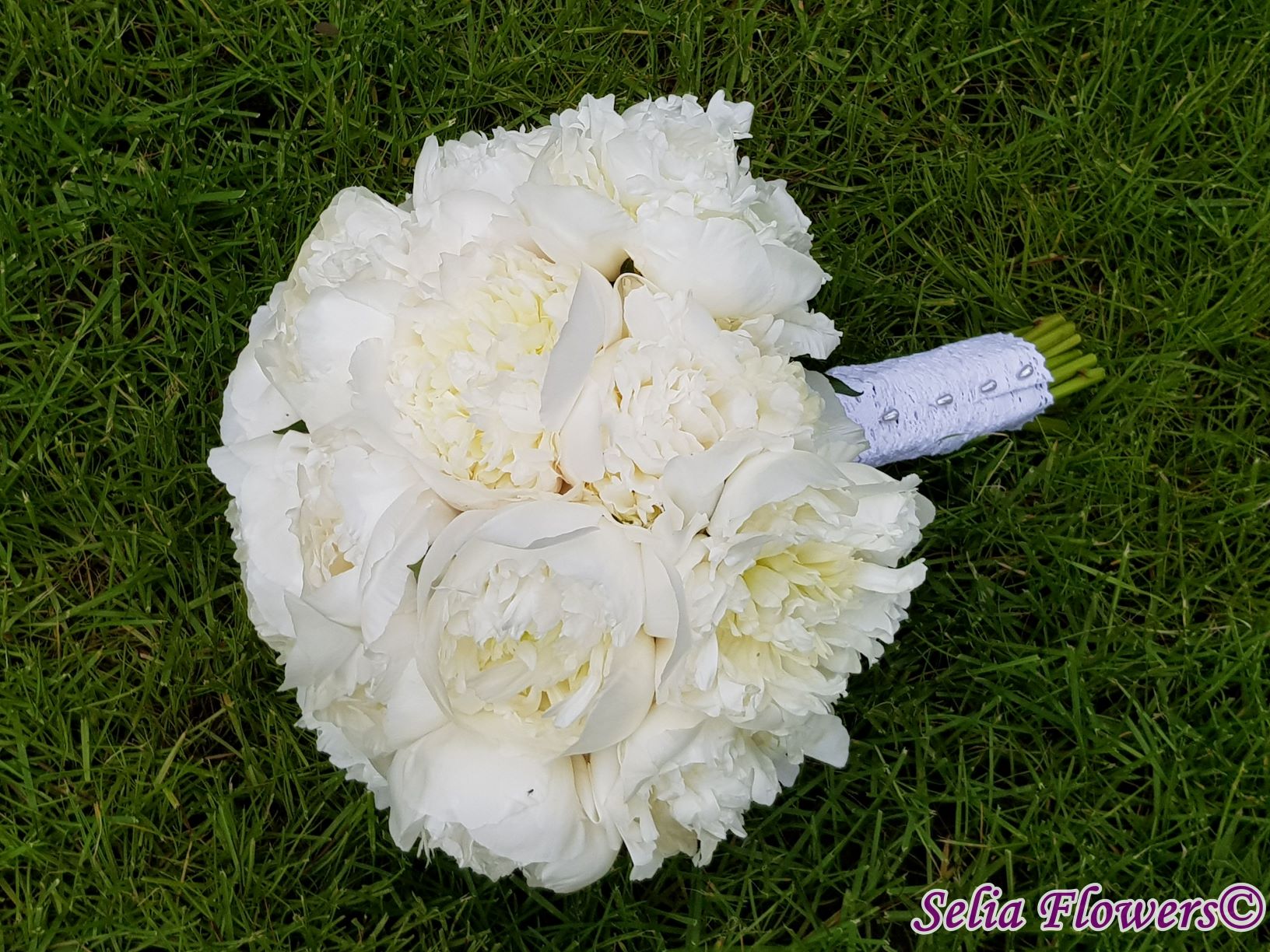Un buchet pentru o mireasă romantică, construit cu 21 de fire de bujori albi.