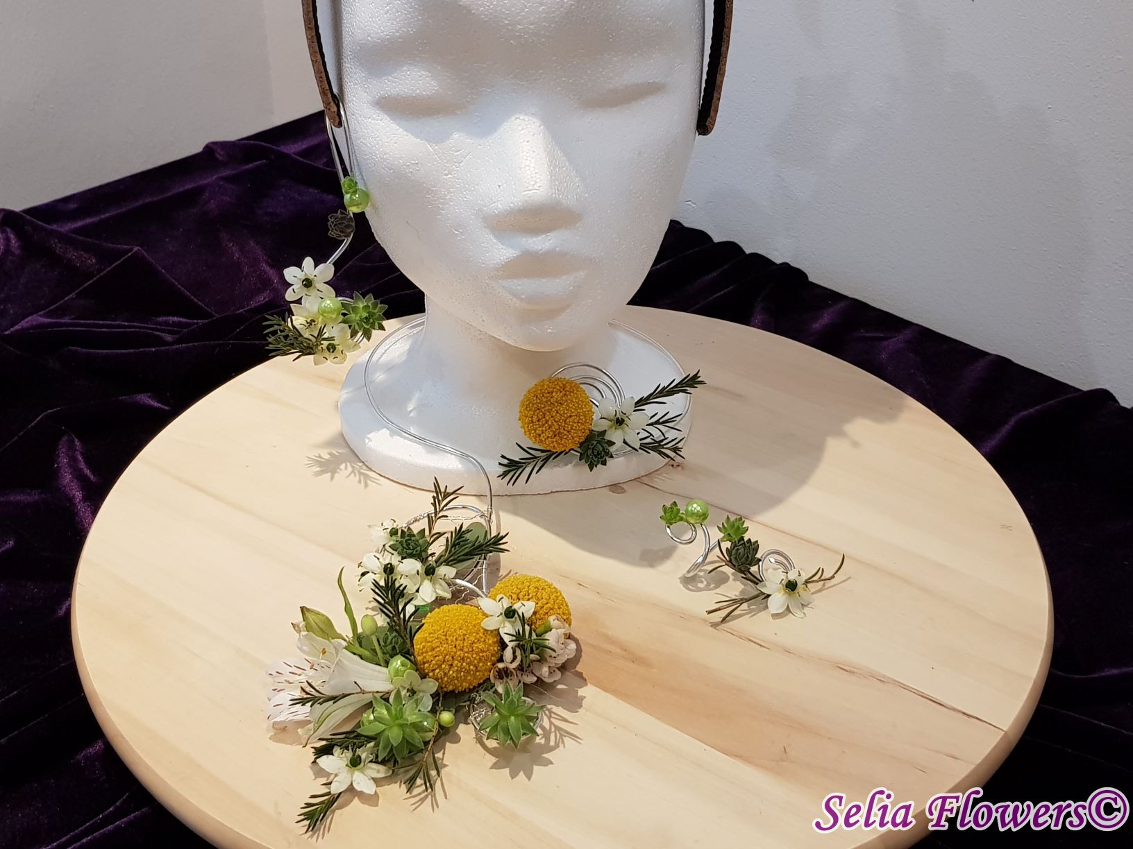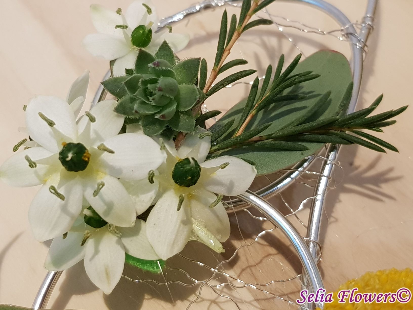 Bijuterie handmade tip colier, lucrata cu sarma floristica decorativa si accesorizata cu flori naturale de ornithogalum, craspedia, wax flower, plante suculente si perle.