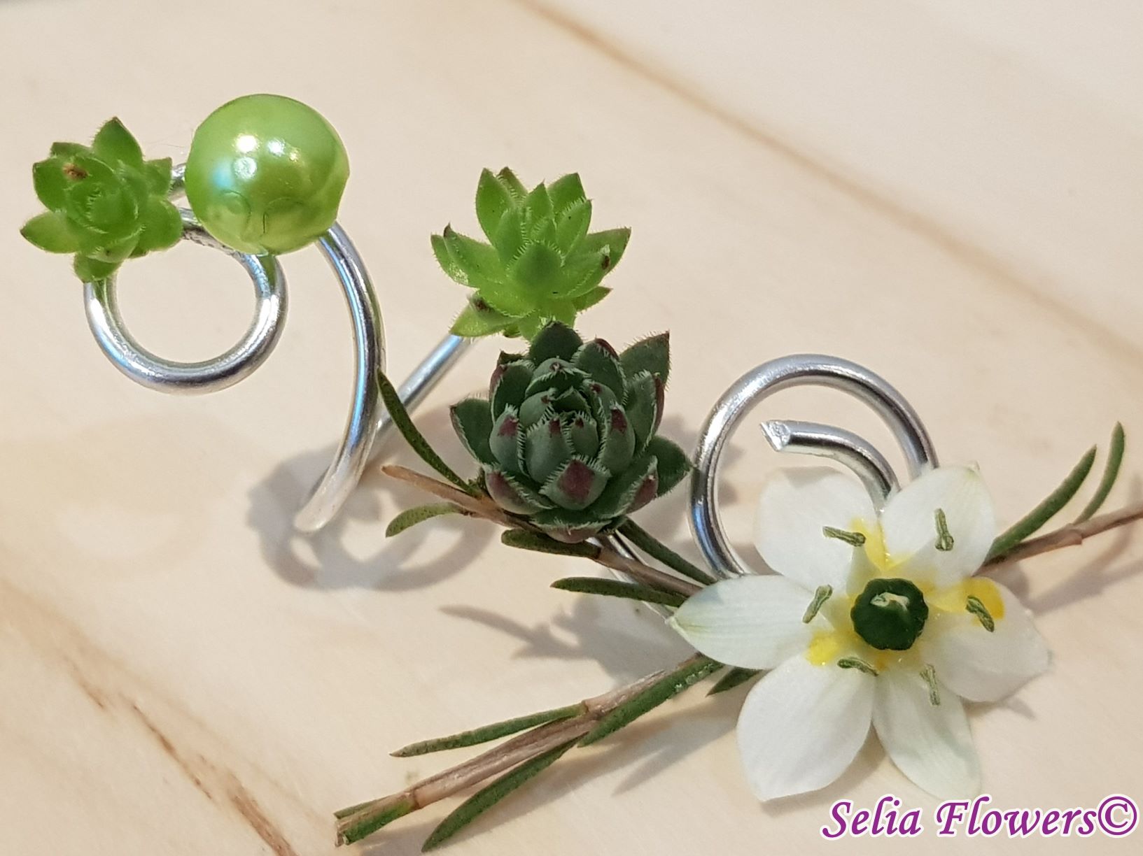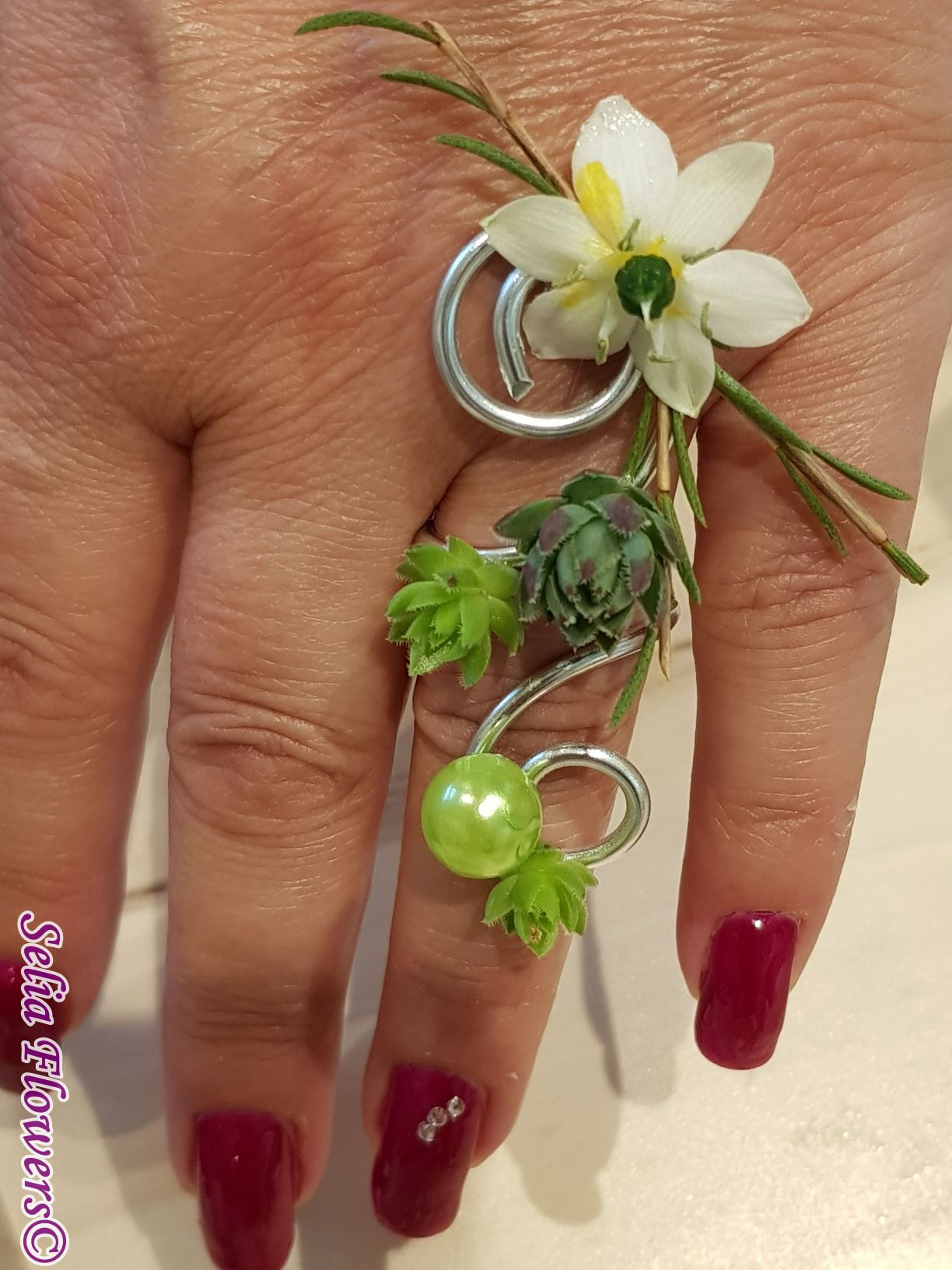 Bijuterie handmade tip inel, lucrata cu sarma floristica decorativa si accesorizata cu flori naturale de ornithogalum, wax flower, plante suculente si perla.