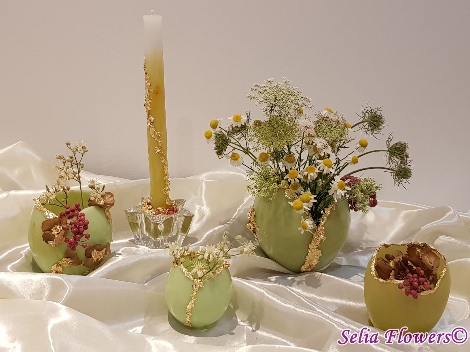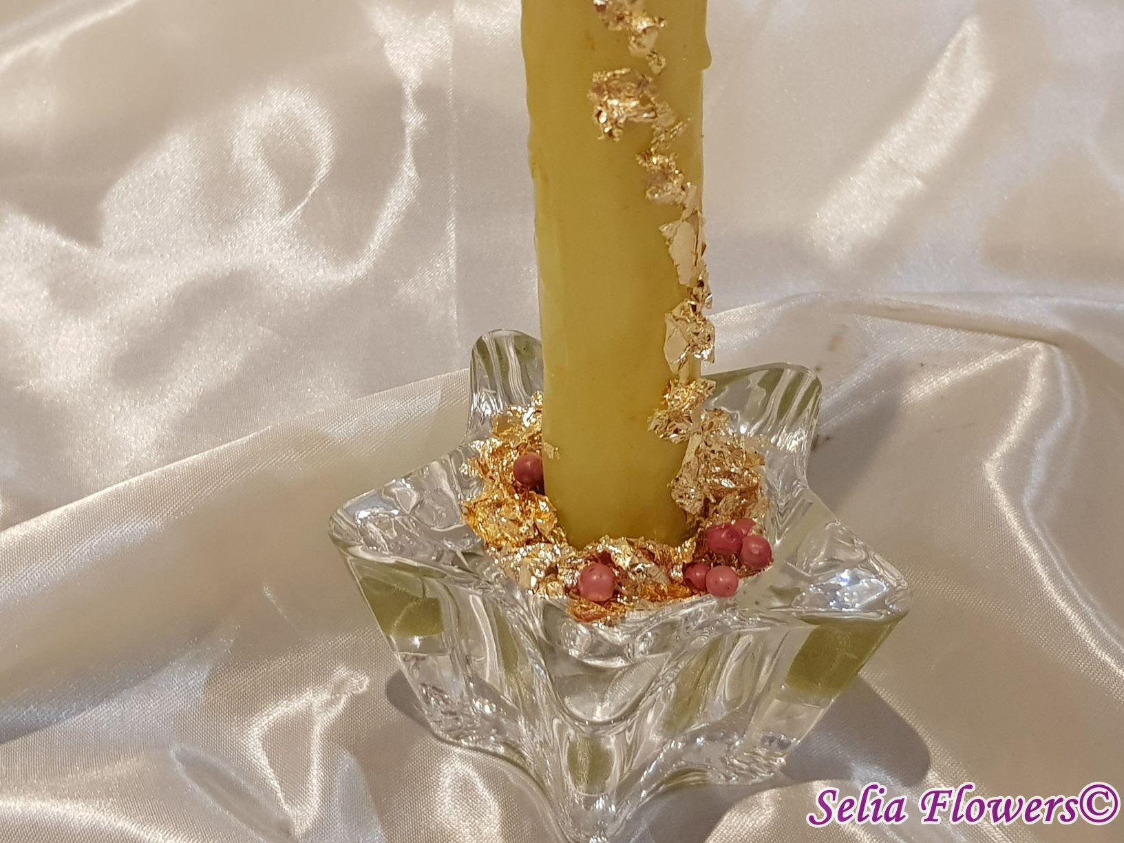 Un element de decor potrivit pentru o masa festivă sau o cină romantică. Lumânarea este prevazută cu inserție de fulgi din foiță de aur și pigment de culoare galbenă. Este un produs handmade realizat in atelierul floral Selia Flowers. Comanda minimă este de două bucăți. Suportul nu este inclus în preț și se poate achiziona doar la cerere, contra cost.