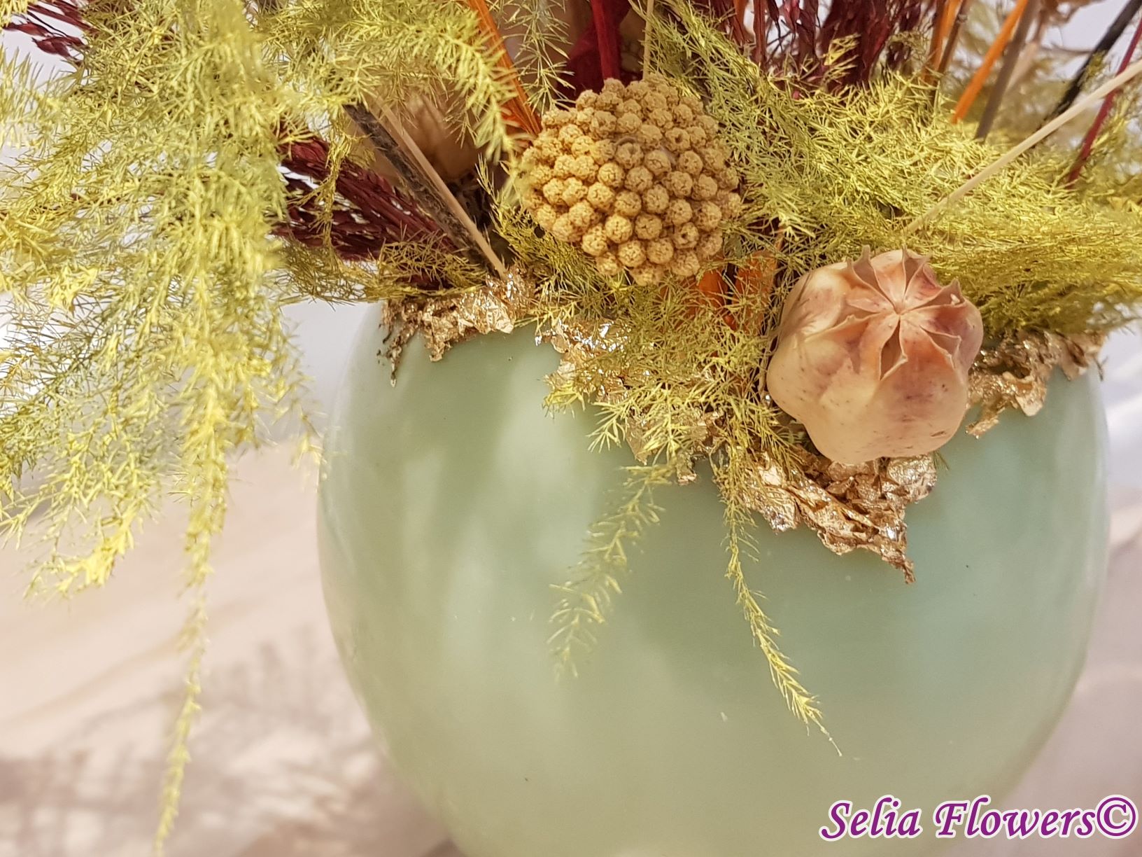 Un vas elegant pentru decorarea mesei, realizat din ceară și prevăzut cu inserție de fulgi din foiță de aur. Vasul este decorat cu flori naturale. Este un produs handmade realizat în atelierul nostru floral.