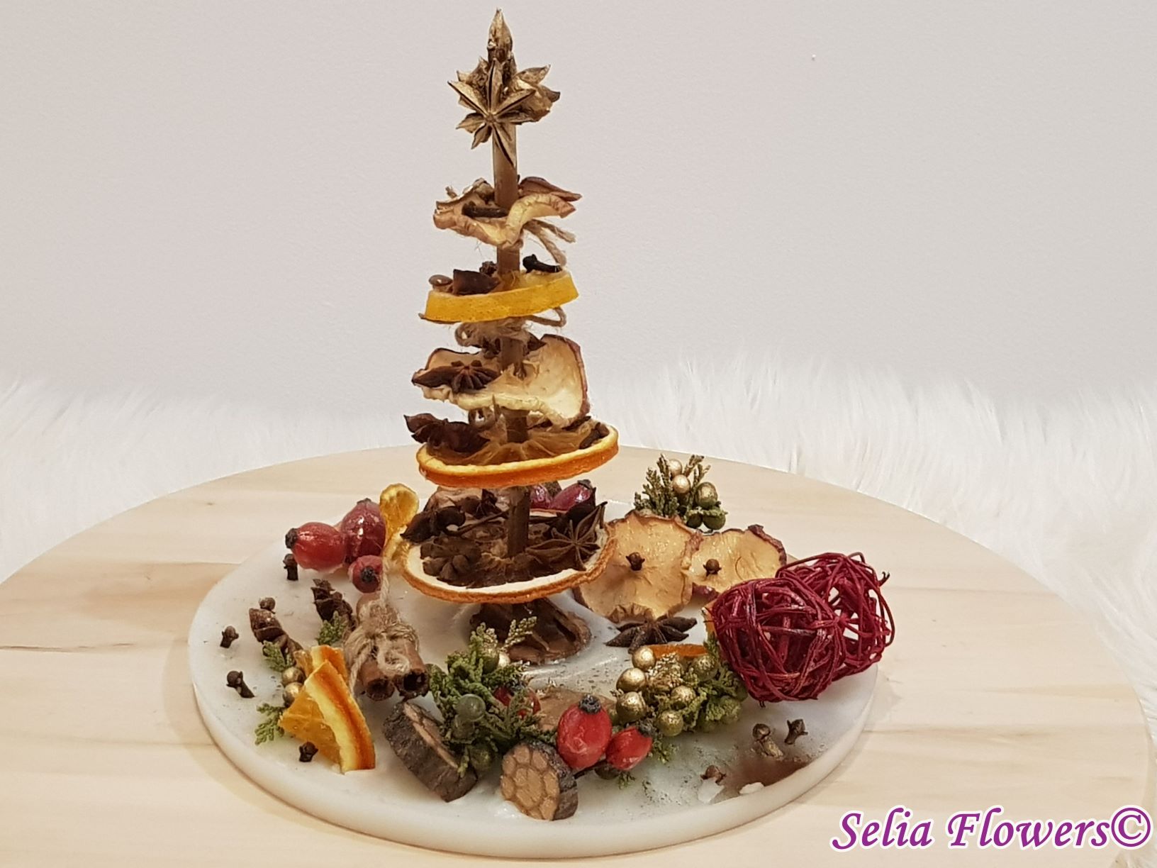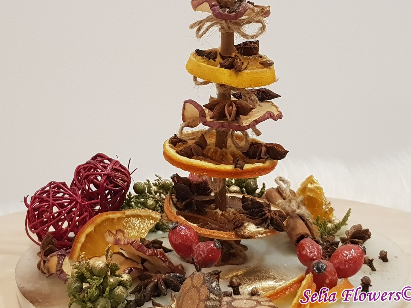 Diametrul aranjamentului este de 25-26 cm si este un produs handmade realizat din ceară in atelierul nostru floral. Este decorat cu bradut construit cu felii de fructe deshidratate (grapefruit, portocala, lamaie, mar), elemente aromatice (scortisoara, anason, cuisoare), crengute de brad, macese si accesorii de sezon.