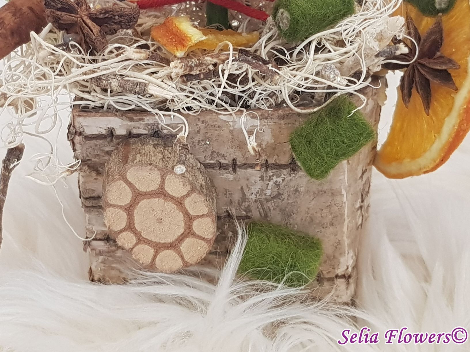 Un bradut cu miresme de Craciun, un aranjament unicat construit in cub de mesteacan cu latura de 7cm, din felii de fructe deshidratate (grapefruit, portocala, lamaie, mar). Este decorat cu elemente decorative aromatice (scortisoara, anason, cuisoare), muschi uscat cret de culoare alba, accesorii din lana. Inaltimea aranjamentului este de 27 cm, din care 20 cm este cea a bradutului construit.