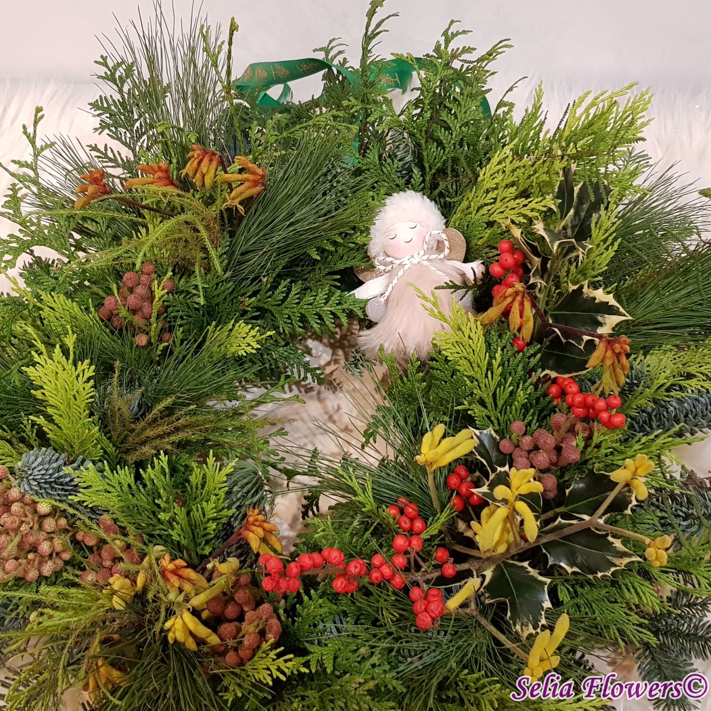 Coronița este construită pe burete floral Oasis, exclusiv din elemente naturale: mix de conifere (brad natural argintiu, tuia și pin), berzelia, ilex , anigozanthos și koralfern. Diametrul coronitei este de 45-48 cm.